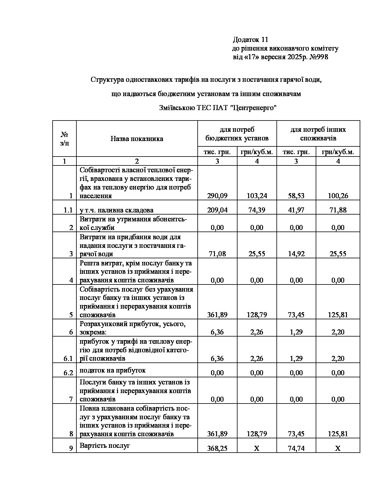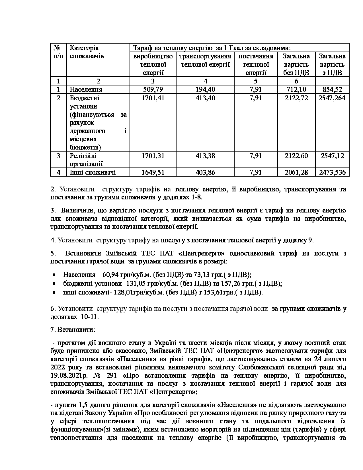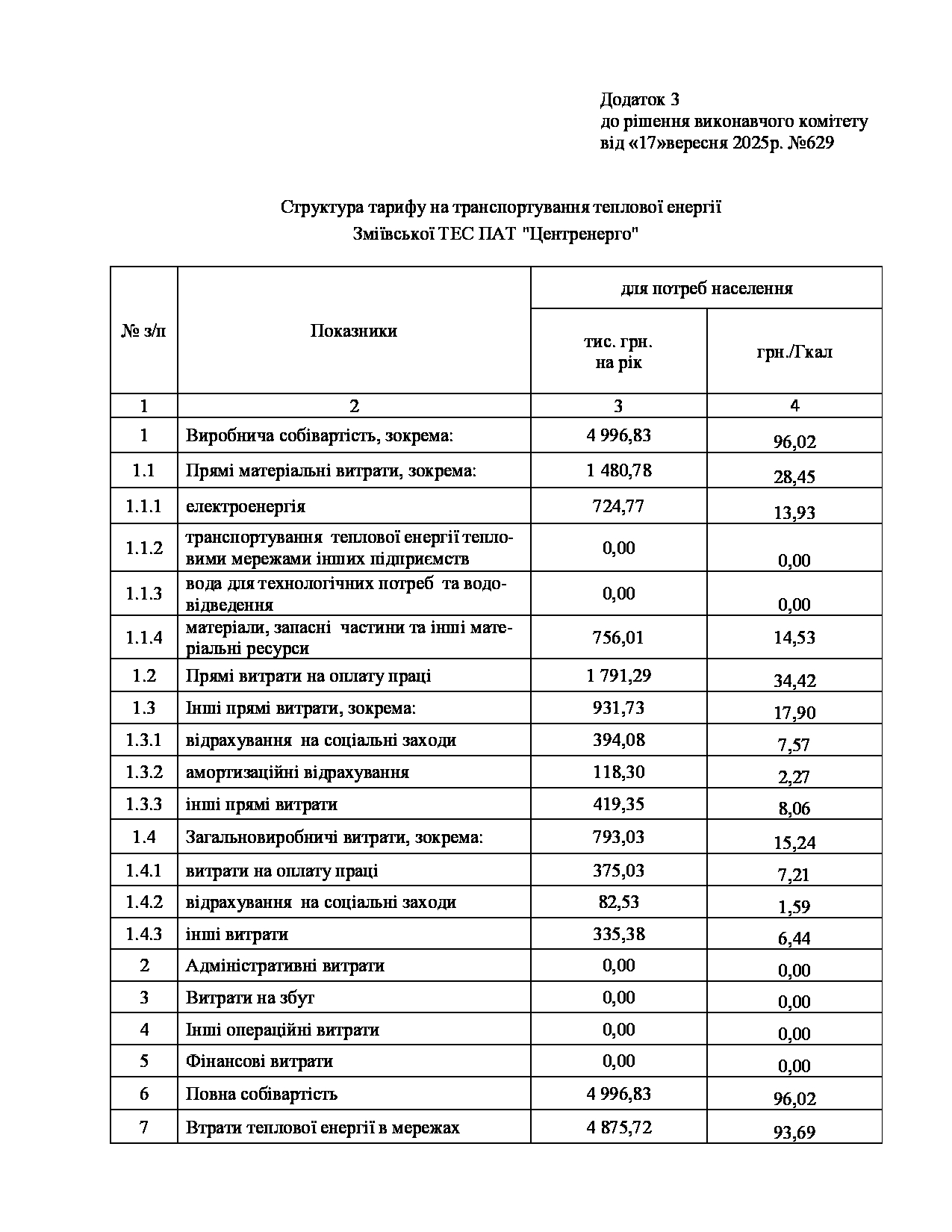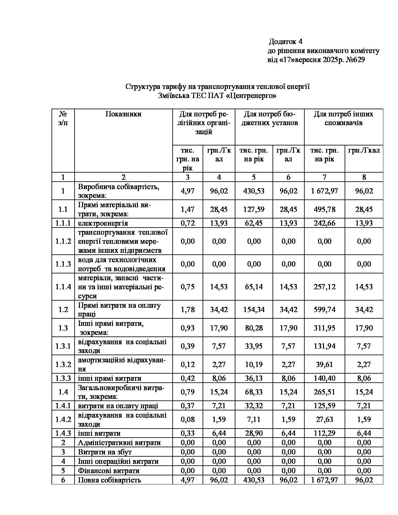 Рішення виконавчого комітету №629 Про встановлення Зміївській ТЕС ПАТ «Центренерго» тарифів на теплову енергію, її виробництво, транспортування, постачання та послуг з постачання теплової енергії і гарячої води