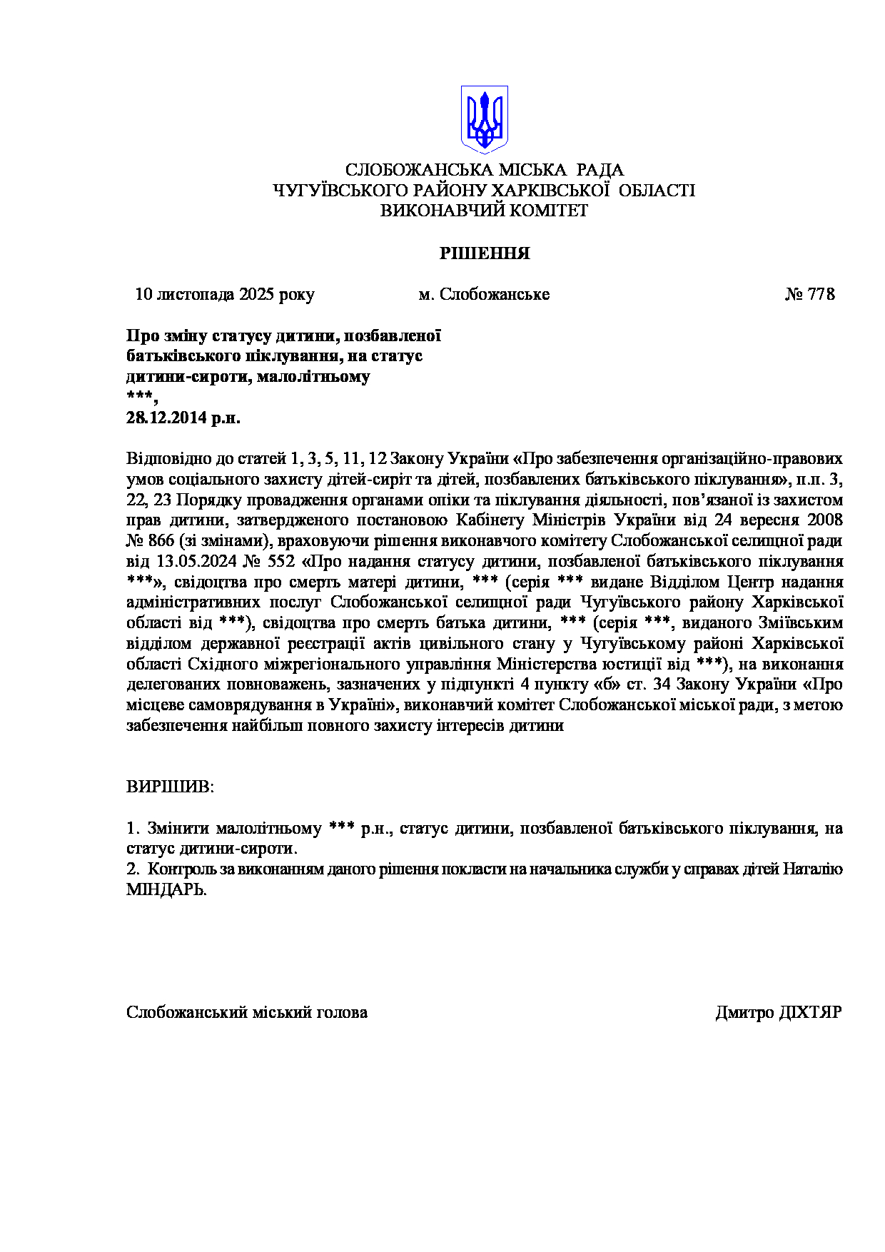 Рішення виконавчого комітету №778 Про зміну статусу дитини, позбавленої батьківського піклування, на статус дитини-сироти, малолітньому *** р.н.