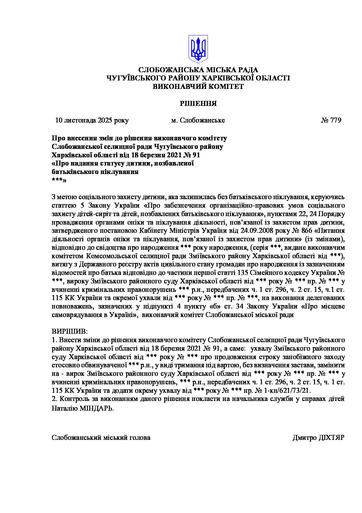 Рішення виконавчого комітету №779 Про внесення змін до рішення виконавчого комітету Слобожанської селищної ради Чугуївського району Харківської області від 18 березня 2021 № 91 «Про надання статусу дитини, позбавленої батьківського піклування ***».