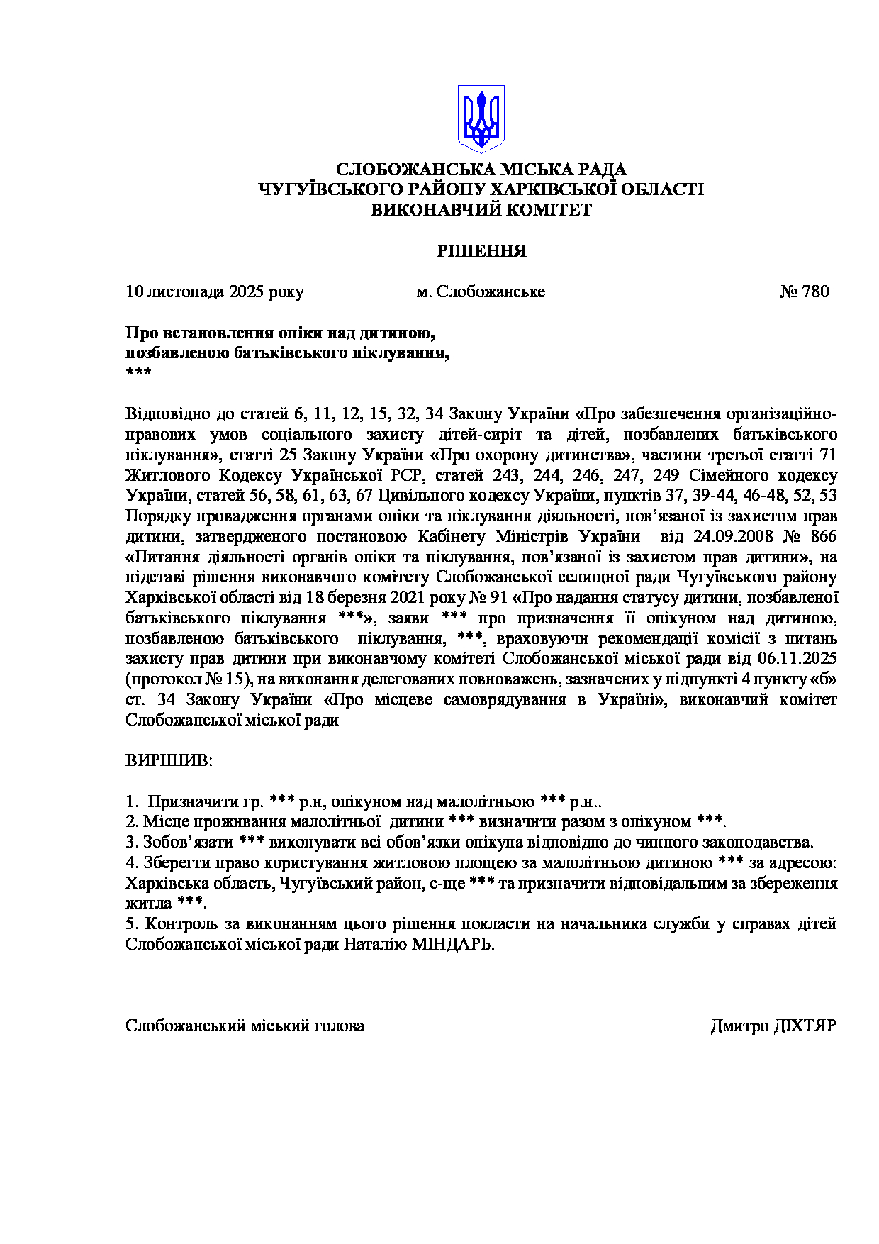 Рішення виконавчого комітету №780 Про встановлення опіки над дитиною, позбавленою батьківського піклування, ***.