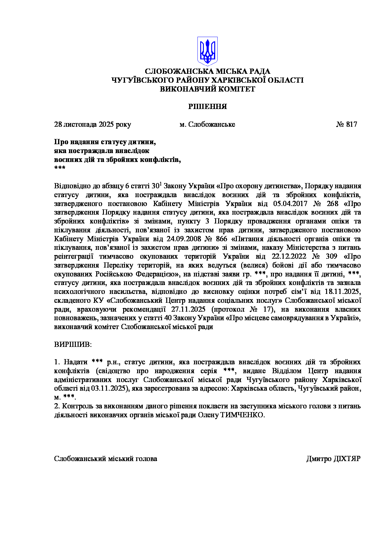 Рішення виконавчого комітету №817 Про надання статусу дитини, яка постраждала внаслідок воєнних дій та збройних конфліктів, ***.
