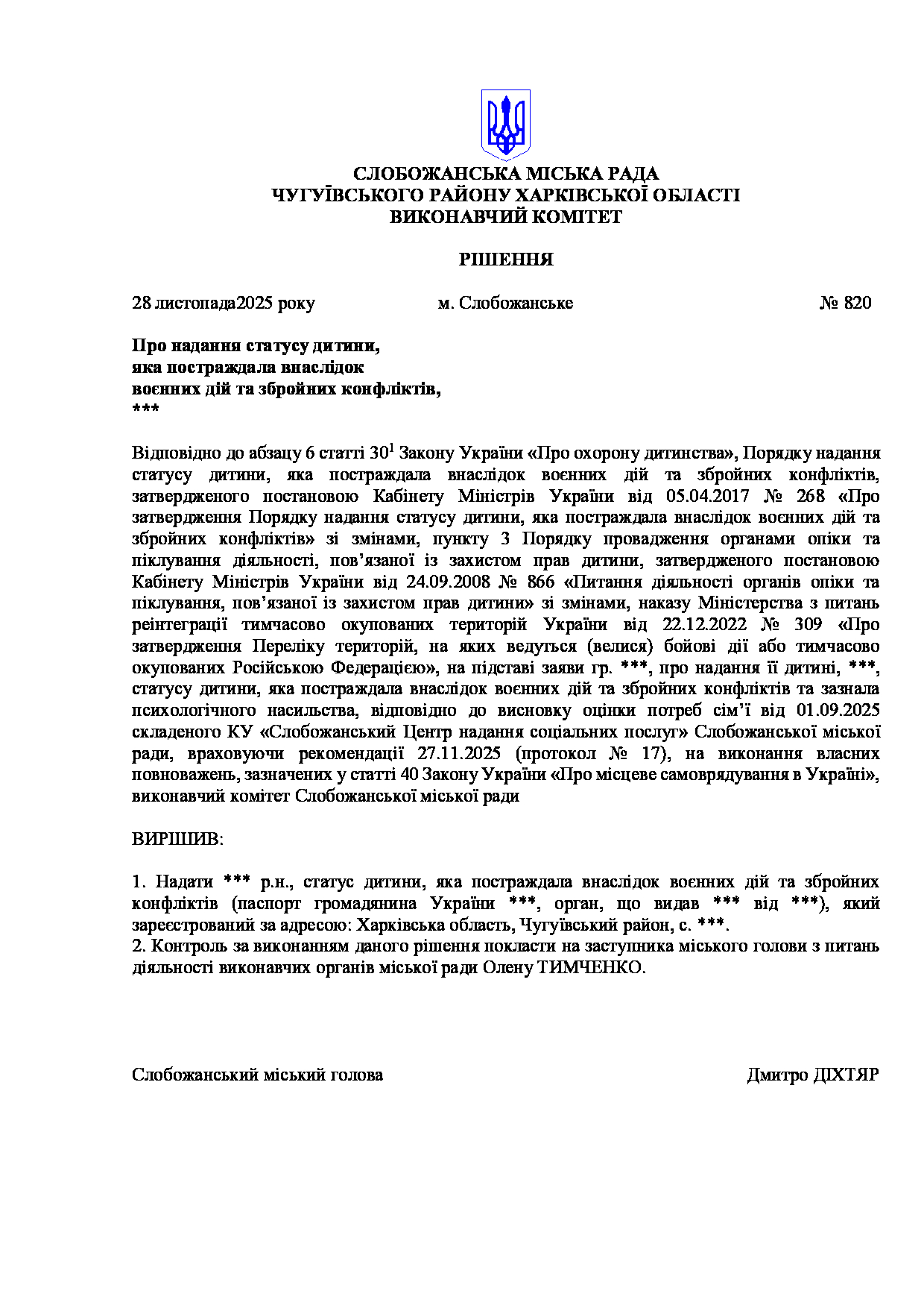 Рішення виконавчого комітету №820 Про надання статусу дитини, яка постраждала внаслідок воєнних дій та збройних конфліктів, ***.