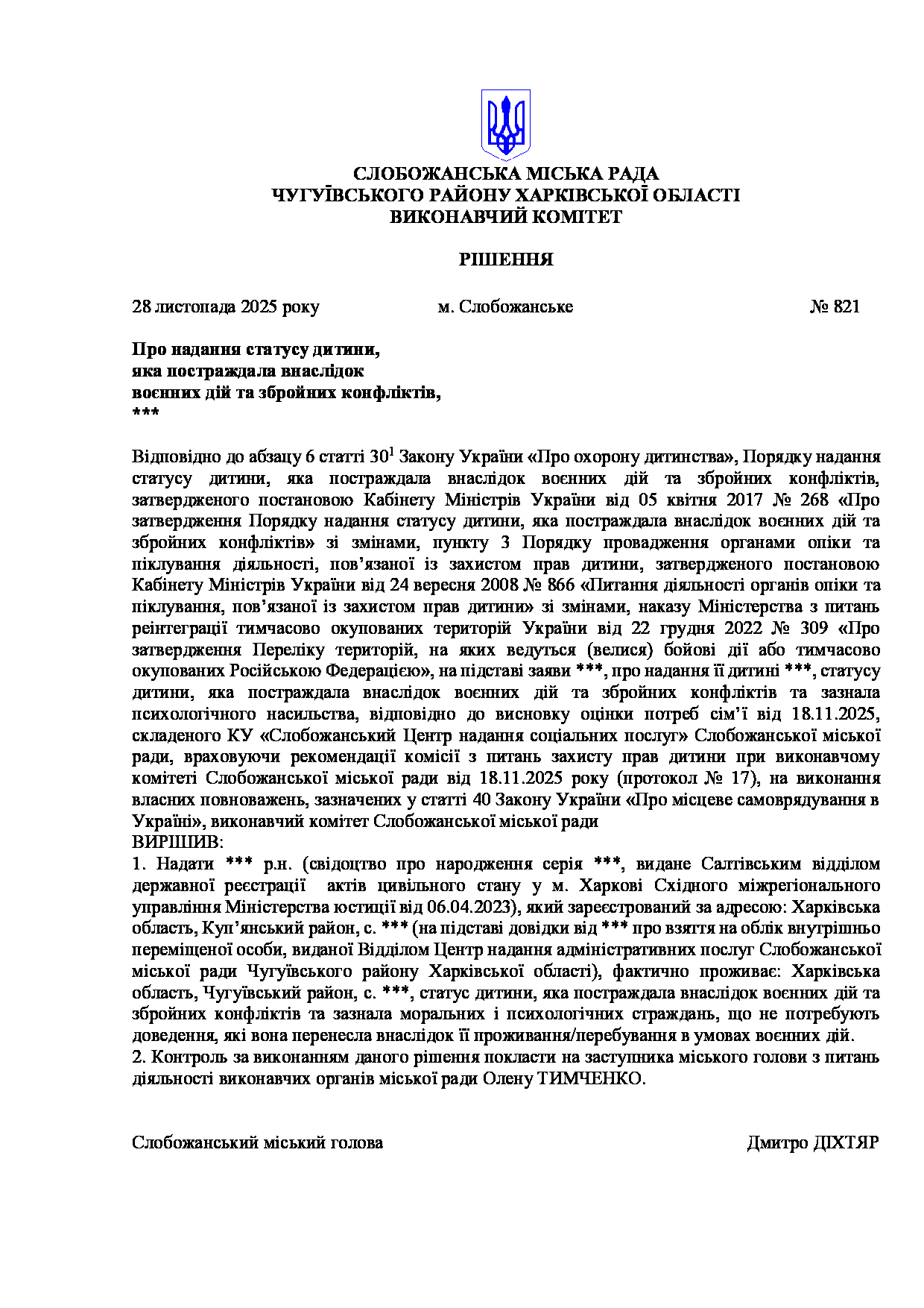 Рішення виконавчого комітету №821 Про надання статусу дитини, яка постраждала внаслідок воєнних дій та збройних конфліктів, ***.