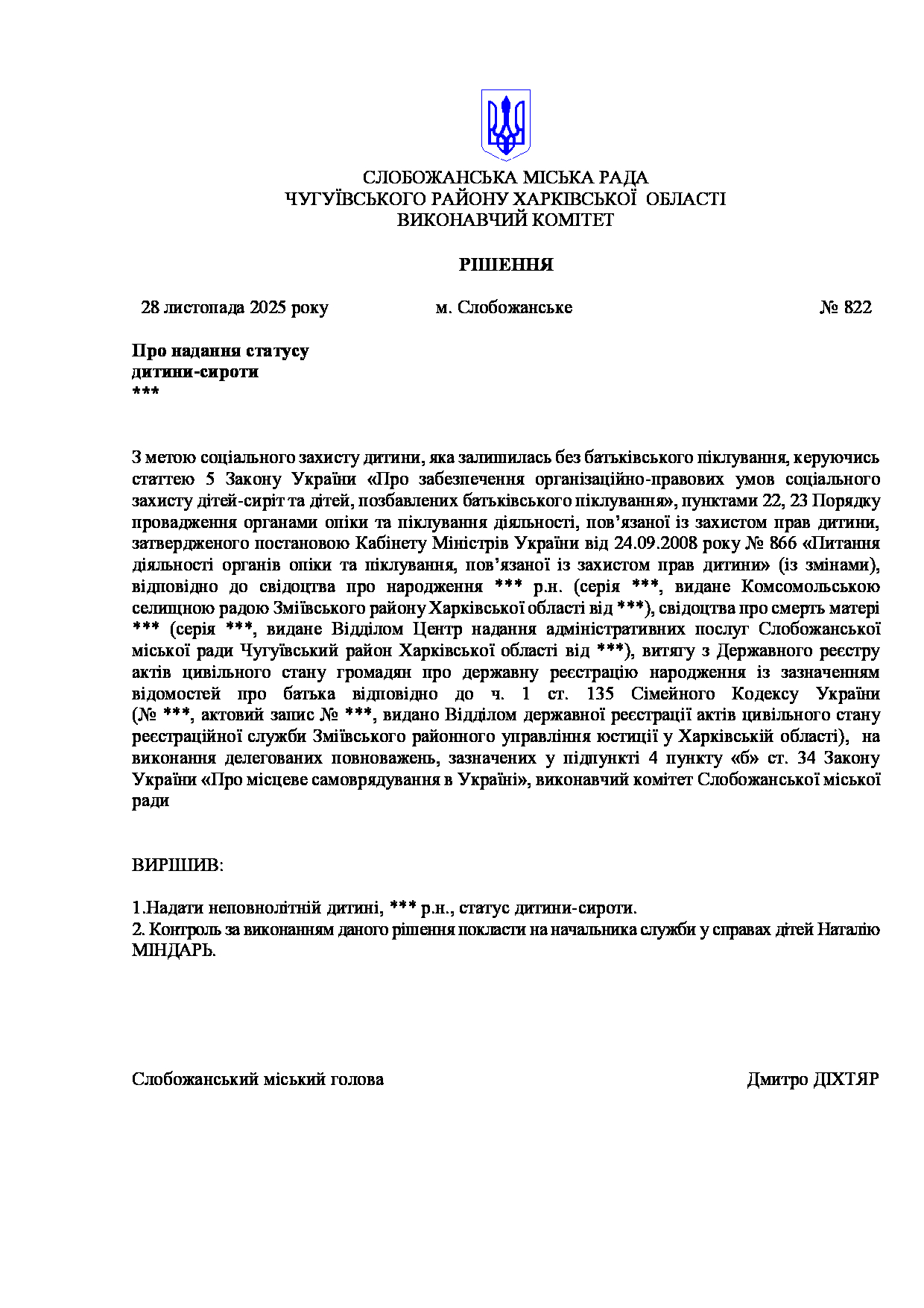 Рішення виконавчого комітету №822 Про надання статусу дитини-сироти ***.