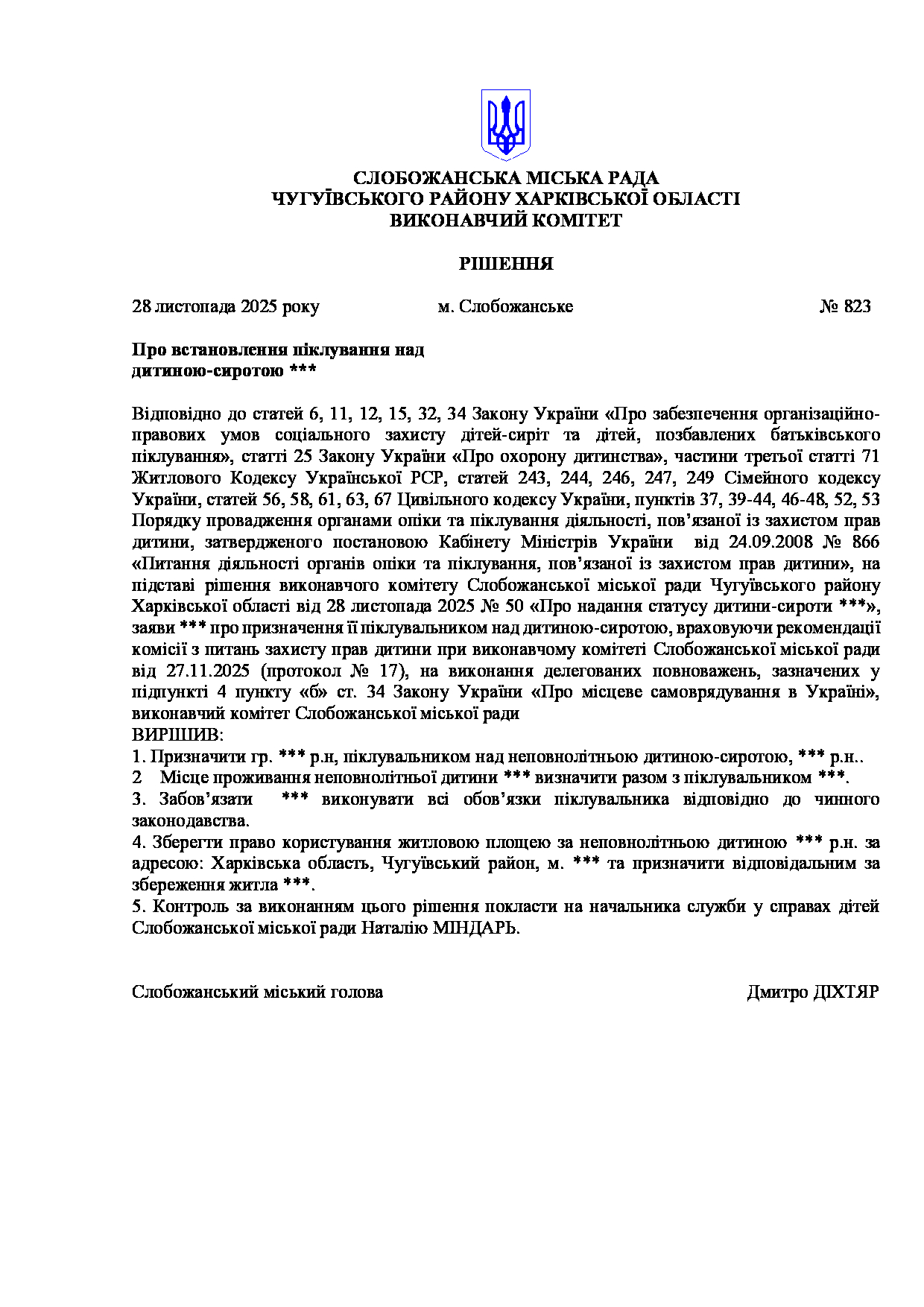 Рішення виконавчого комітету №823 Про встановлення піклування над дитиною-сиротою ***.