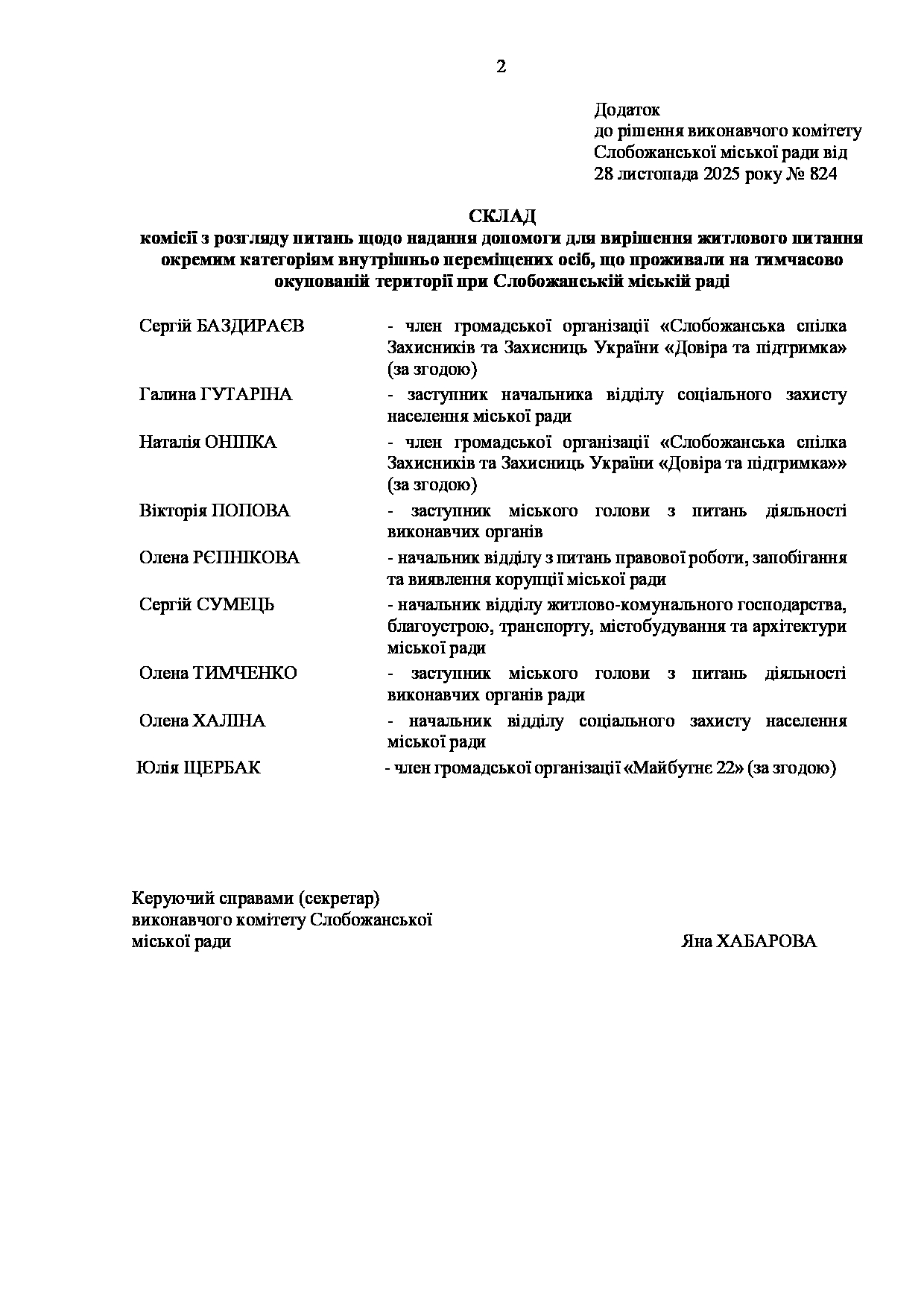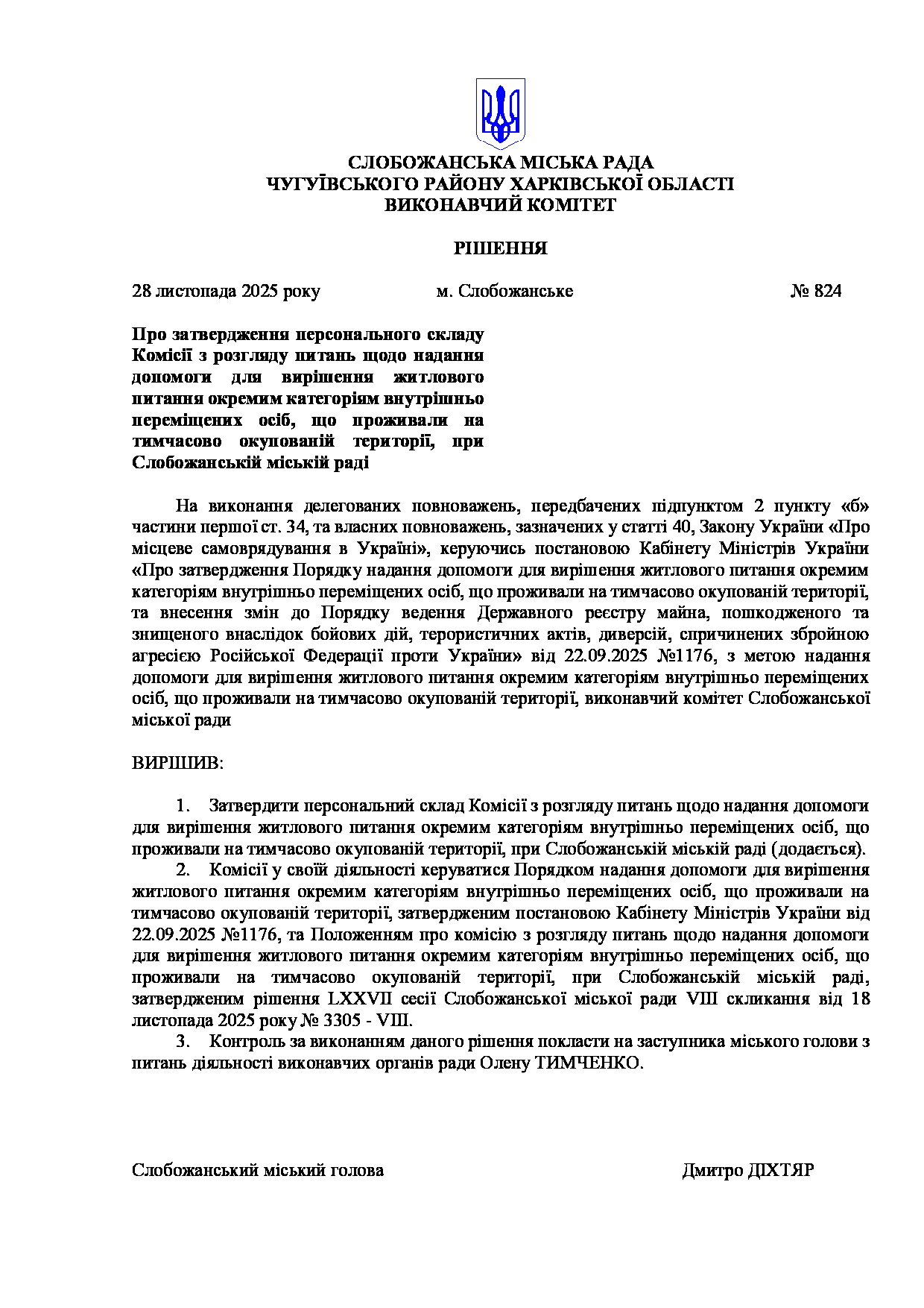 Рішення виконавчого комітету №824 Про затвердження персонального складу Комісії з розгляду питань щодо надання допомоги для вирішення житлового питання окремим категоріям внутрішньо переміщених осіб, що проживали на тимчасово окупованій території, при Слобожанській міській раді.