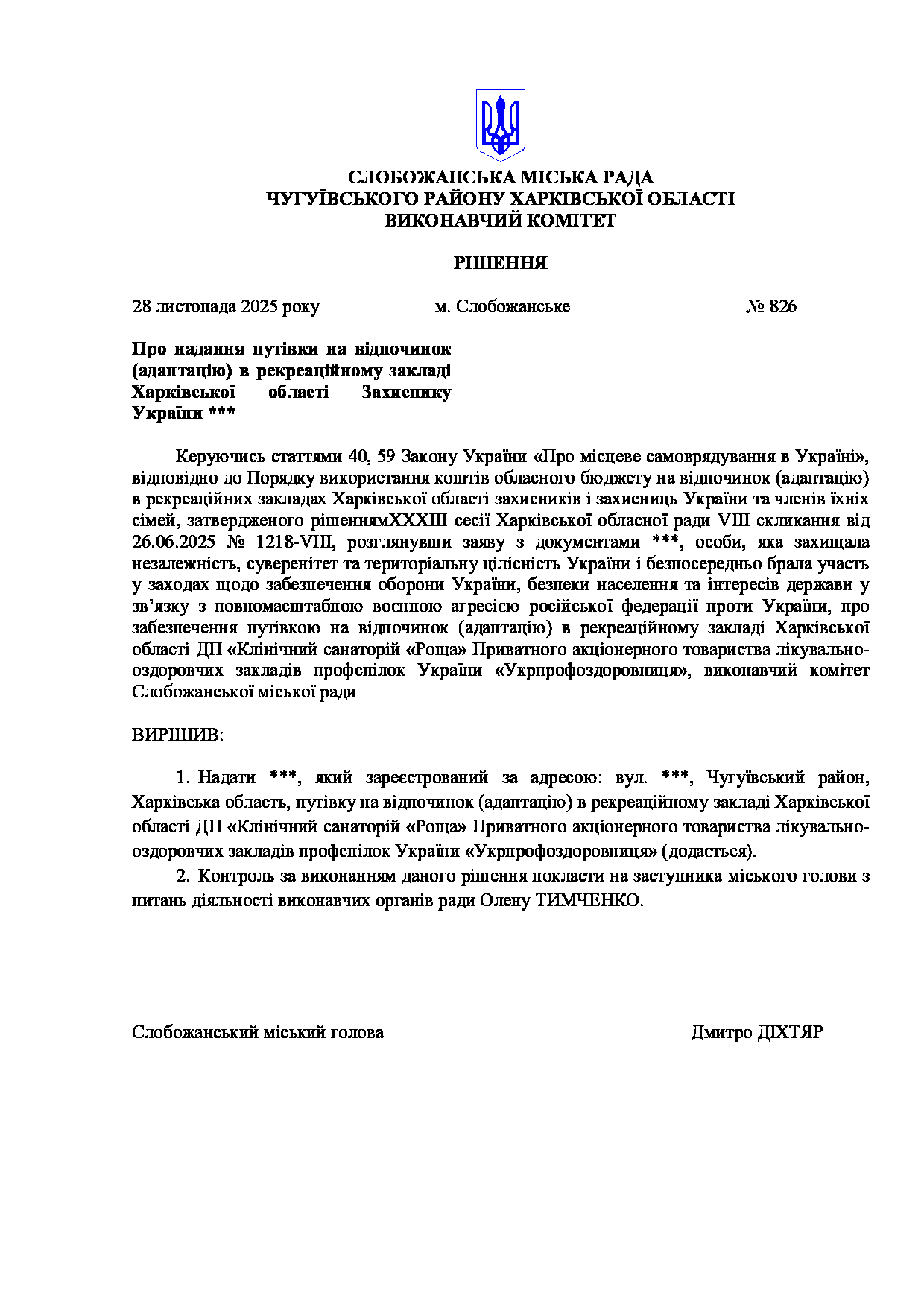 Рішення виконавчого комітету №826 Про надання путівки на відпочинок (адаптацію) в рекреаційному закладі Харківської області Захиснику України ***.