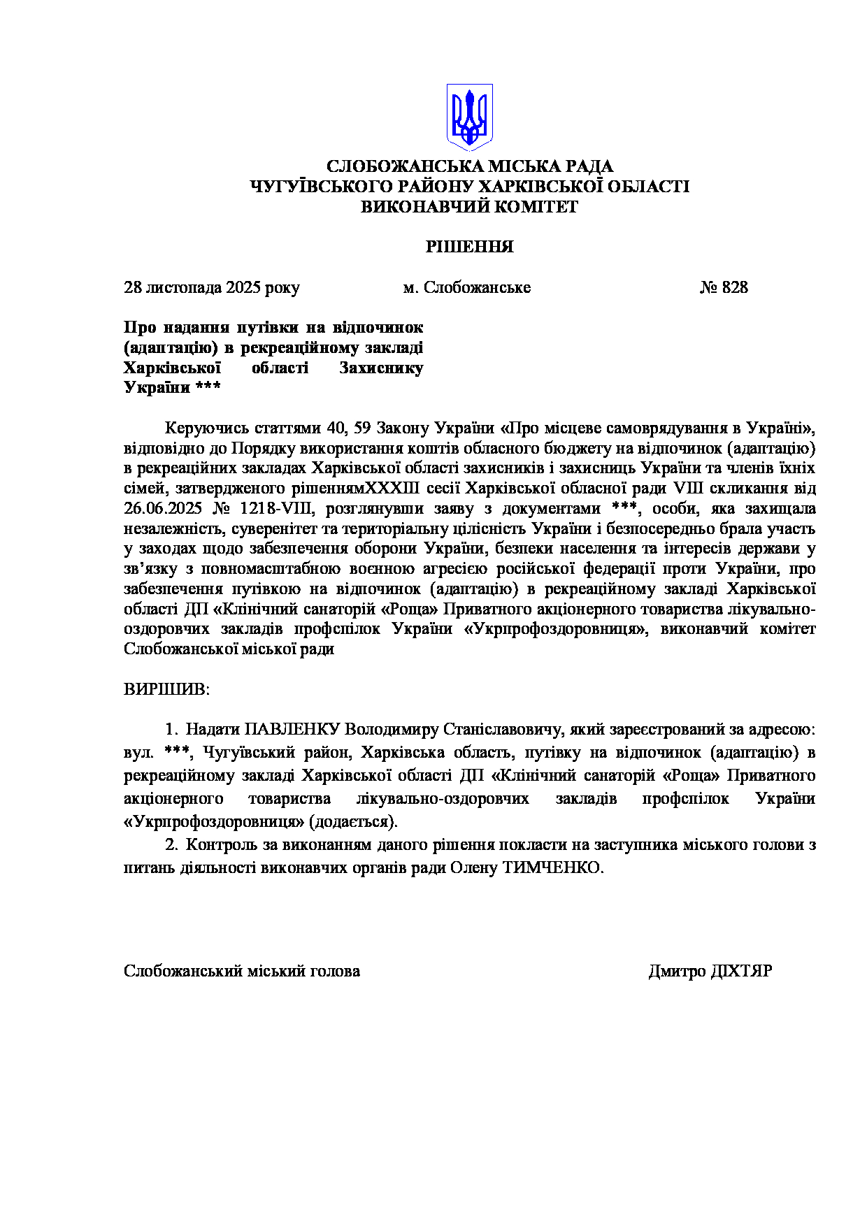 Рішення виконавчого комітету №828 Про надання путівки на відпочинок (адаптацію) в рекреаційному закладі Харківської області Захиснику України ***.