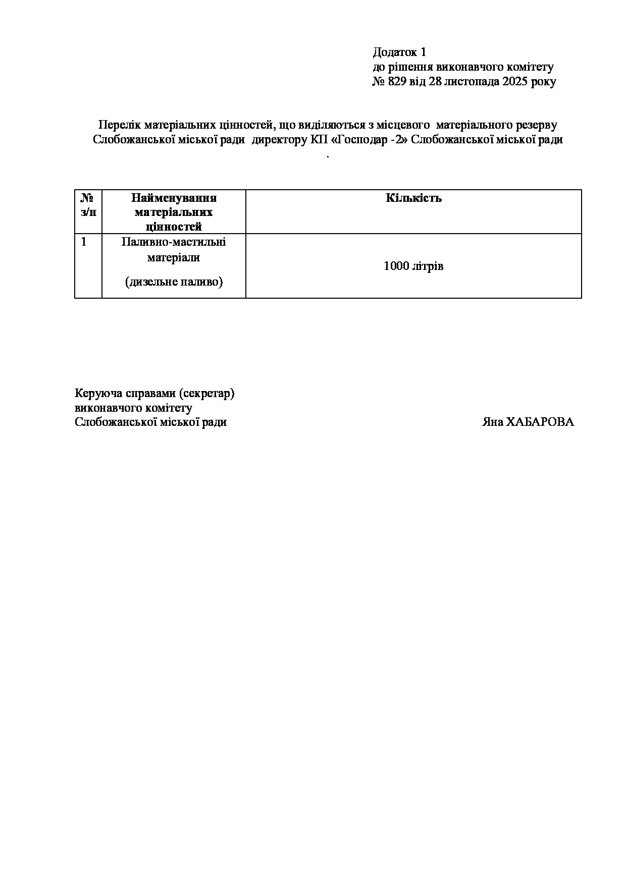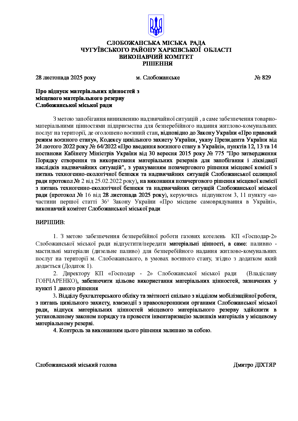 Рішення виконавчого комітету №829 Про відпуск матеріальних цінностей з місцевого матеріального резерву Слобожанської міської ради