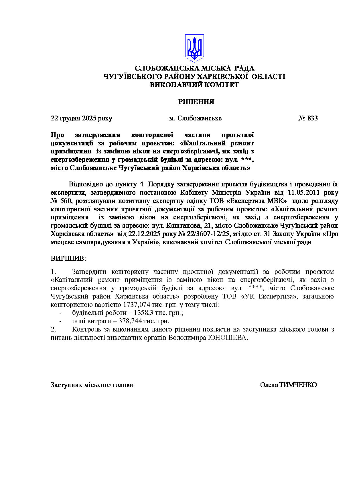 Рішення виконавчого комітету №833 Про затвердження кошторисної частини проєктної документації за робочим проєктом: «Капітальний ремонт приміщення із заміною вікон на енергозберігаючі, як захід з енергозбереження у громадській будівлі за адресою: вул. ***, ***, місто Слобожанське Чугуївський район Харківська область».