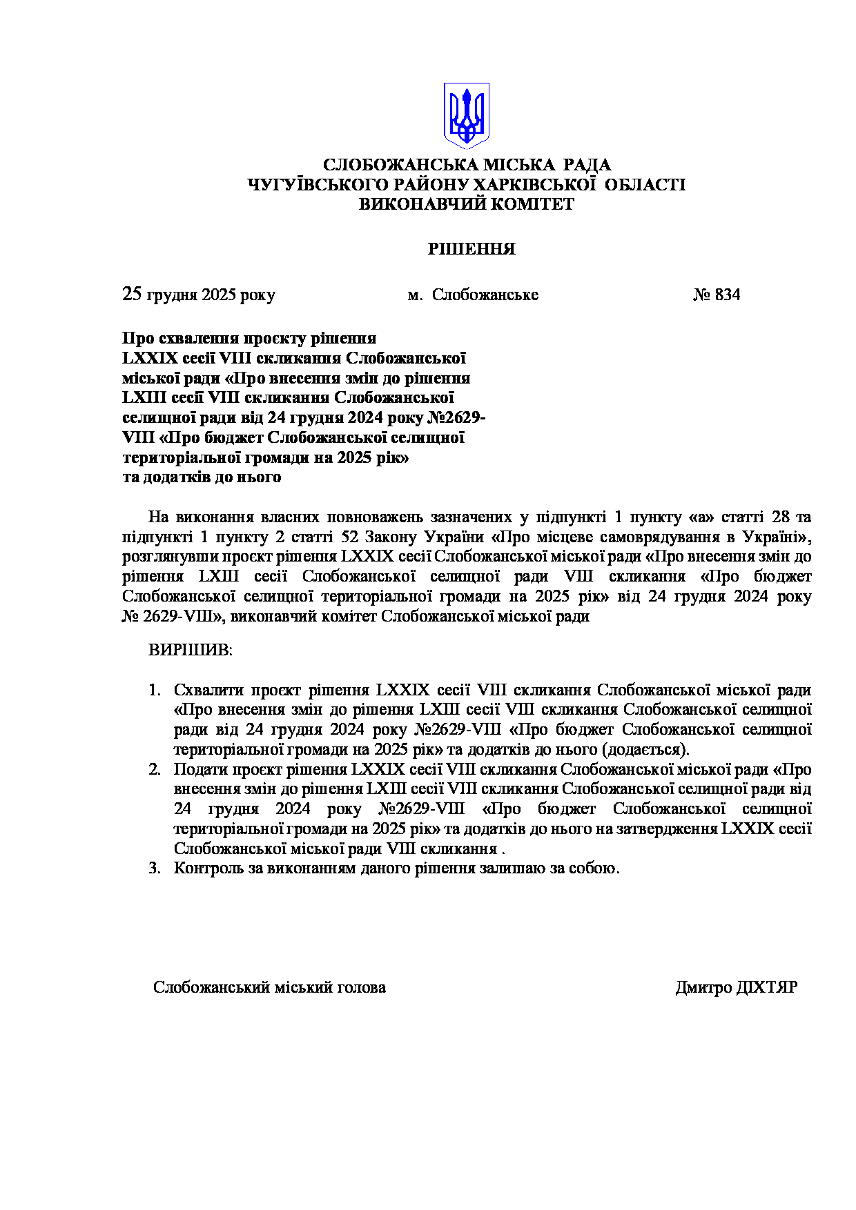 Рішення виконавчого комітету №834 Про схвалення проєкту рішення LXХІX сесії VIII скликання Слобожанської міської ради «Про внесення змін до рішення LXIII сесії VIII скликання Слобожанської селищної ради від 24 грудня 2024 року №2629-VIII «Про бюджет Слобожанської селищної територіальної громади на 2025 рік» та додатків до нього.