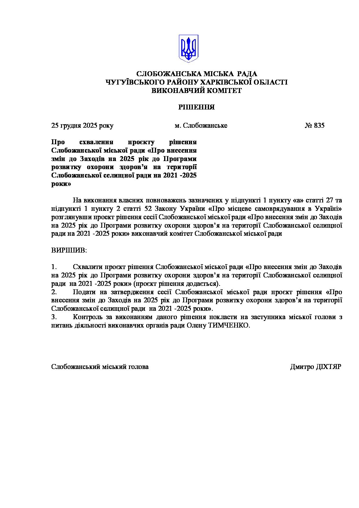 Рішення виконавчого комітету №835 Про схвалення проєкту рішення Слобожанської міської ради «Про внесення змін до Заходів на 2025 рік до Програми розвитку охорони здоров’я на території Слобожанської селищної ради на 2021 -2025 роки».