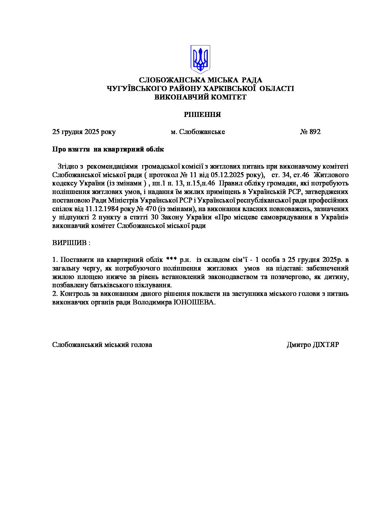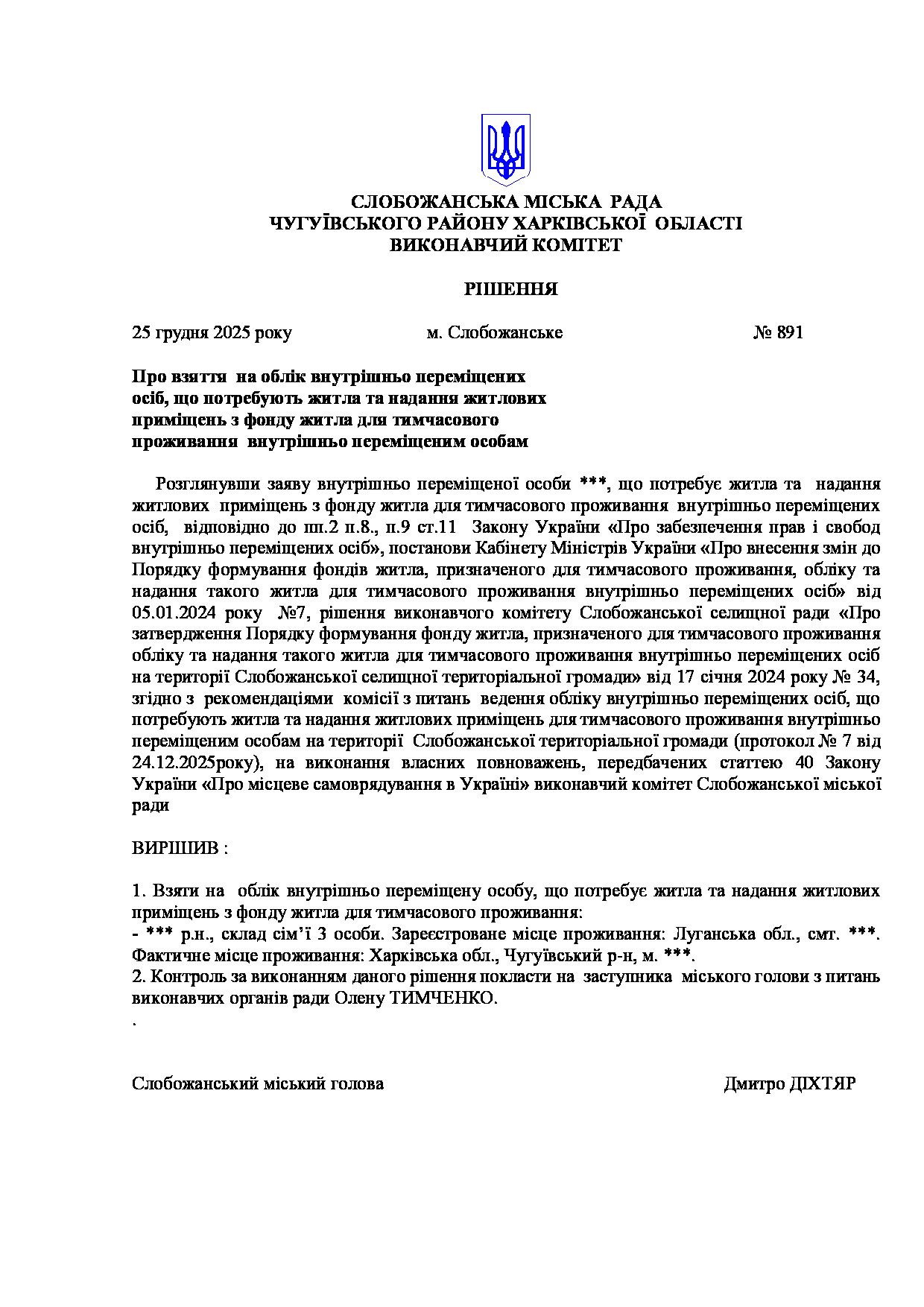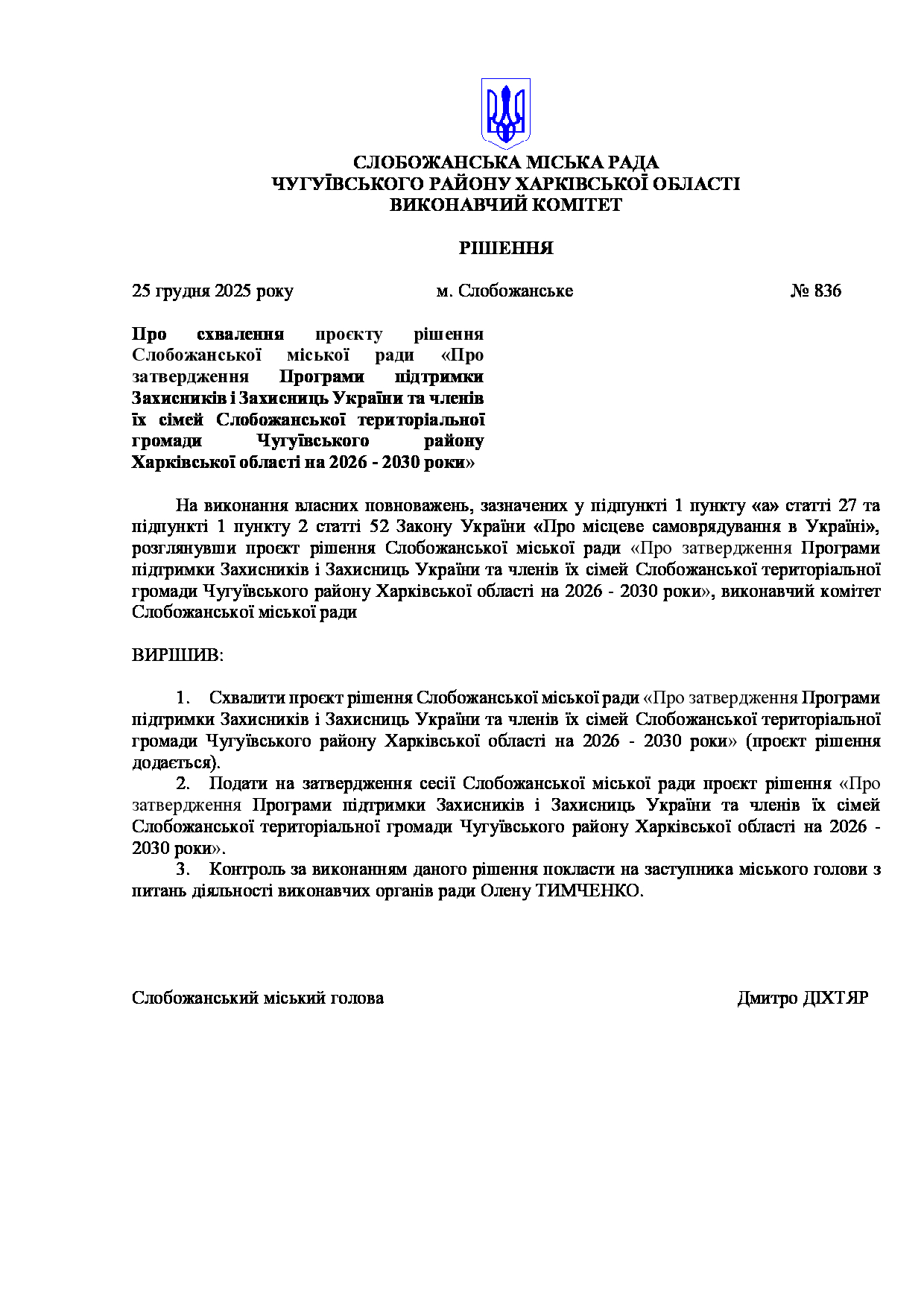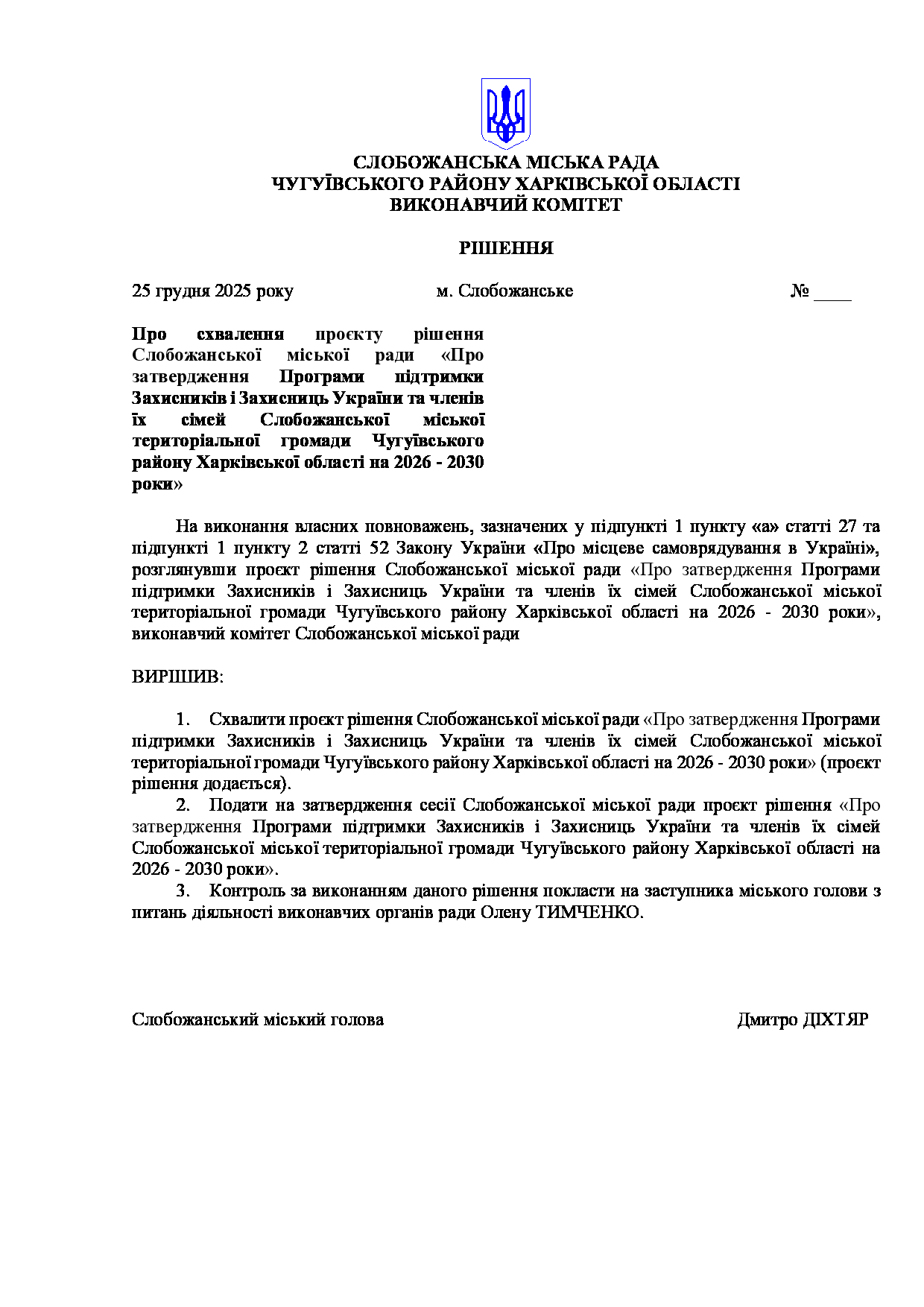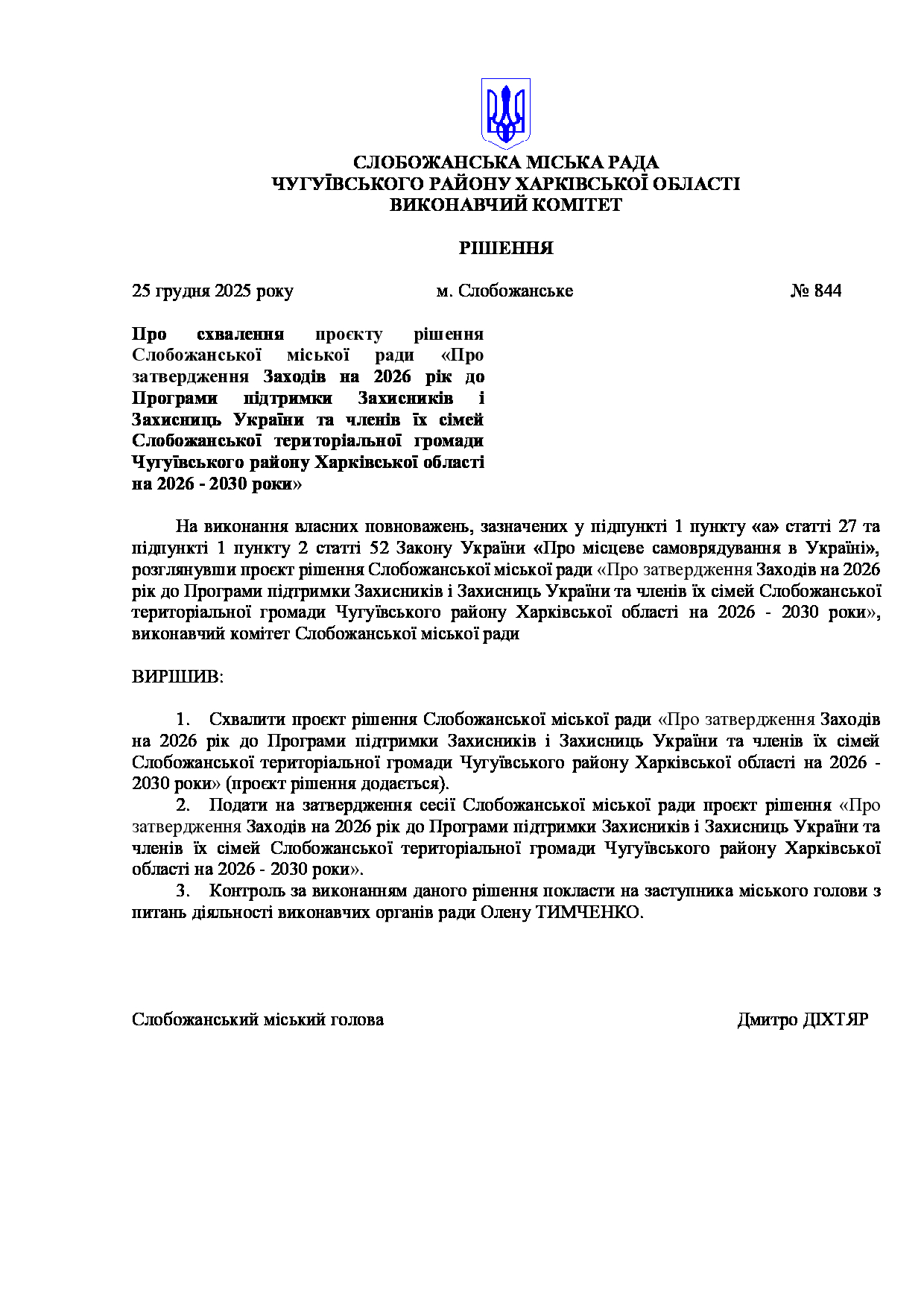 Рішення виконавчого комітету №844 Про схвалення проєкту рішення Слобожанської міської ради «Про затвердження Заходів на 2026 рік до Програми підтримки Захисників і Захисниць України та членів їх сімей Слобожанської міської територіальної громади Чугуївського району Харківської області на 2026 - 2030 роки».