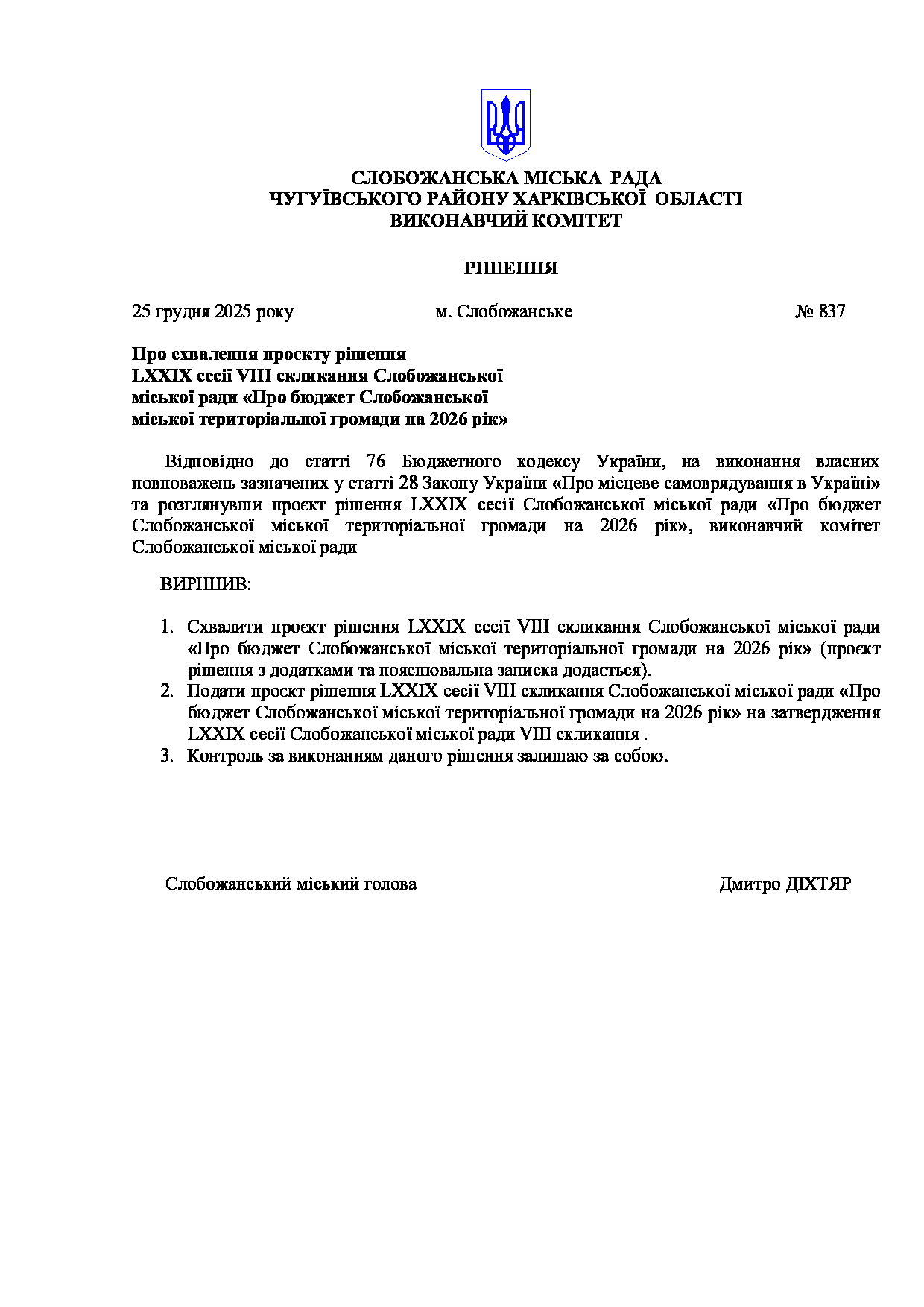 Рішення виконавчого комітету №837 Про схвалення проєкту рішення LXXIX сесії VIII скликання Слобожанської міської ради «Про бюджет Слобожанської міської територіальної громади на 2026 рік».