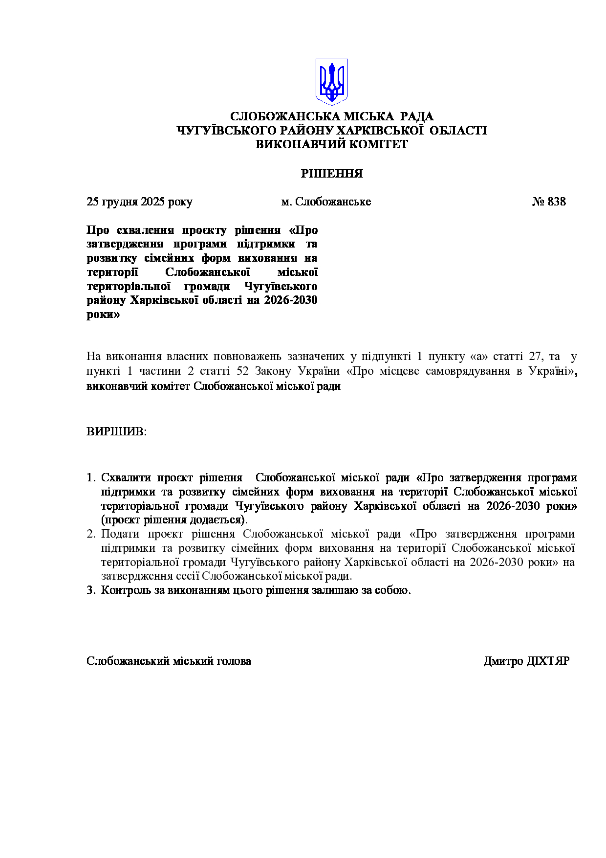 Рішення виконавчого комітету №838 Про схвалення проекту рішення «Про затвердження програми підтримки та розвитку сімейних форм виховання на території Слобожанської міської територіальної громади Чугуївського району Харківської області на 2026-2030 роки».