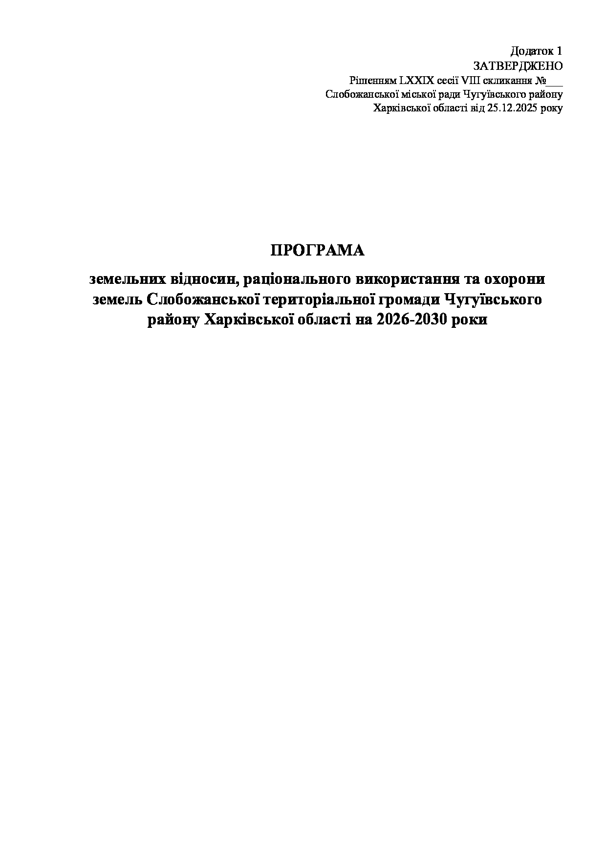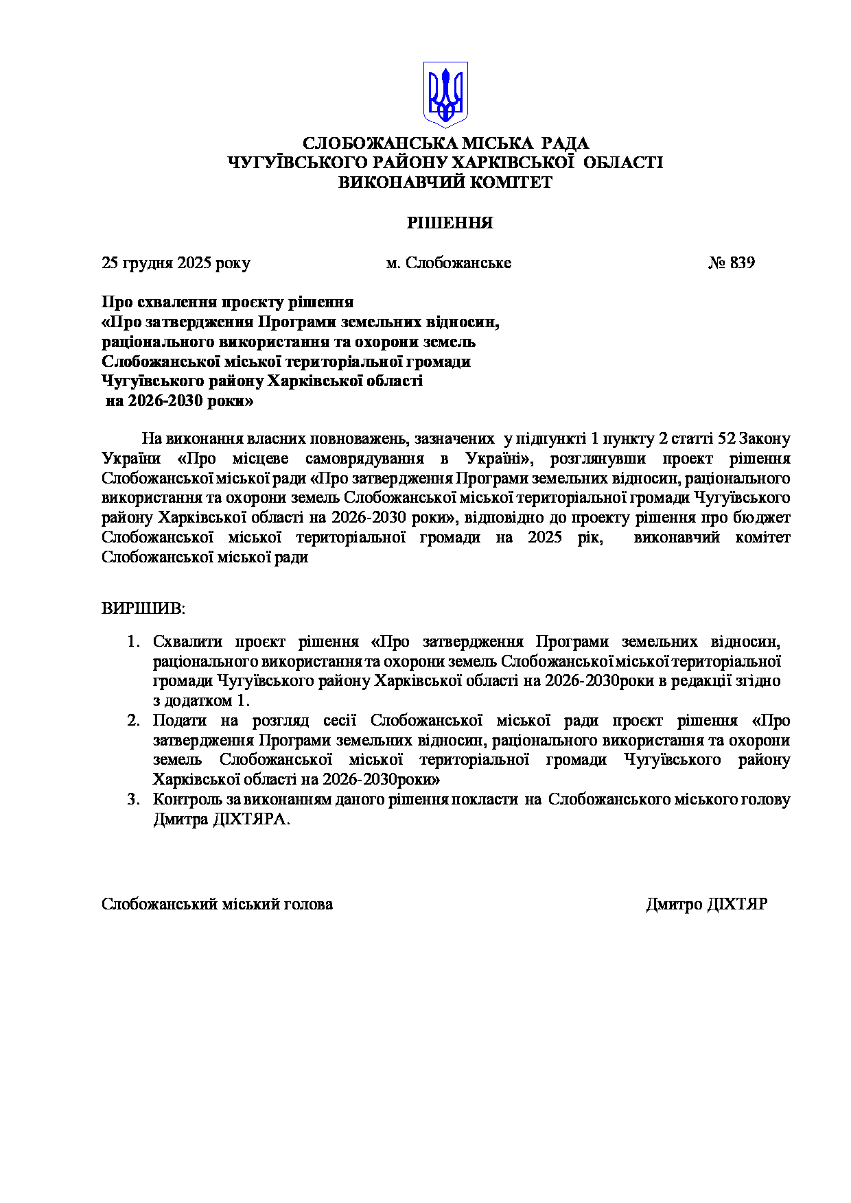 Рішення виконавчого комітету №839 Про схвалення проєкту рішення «Про затвердження Програми земельних відносин, раціонального використання та охорони земель Слобожанської міської територіальної громади Чугуївського району Харківської області на 2026-2030 роки».