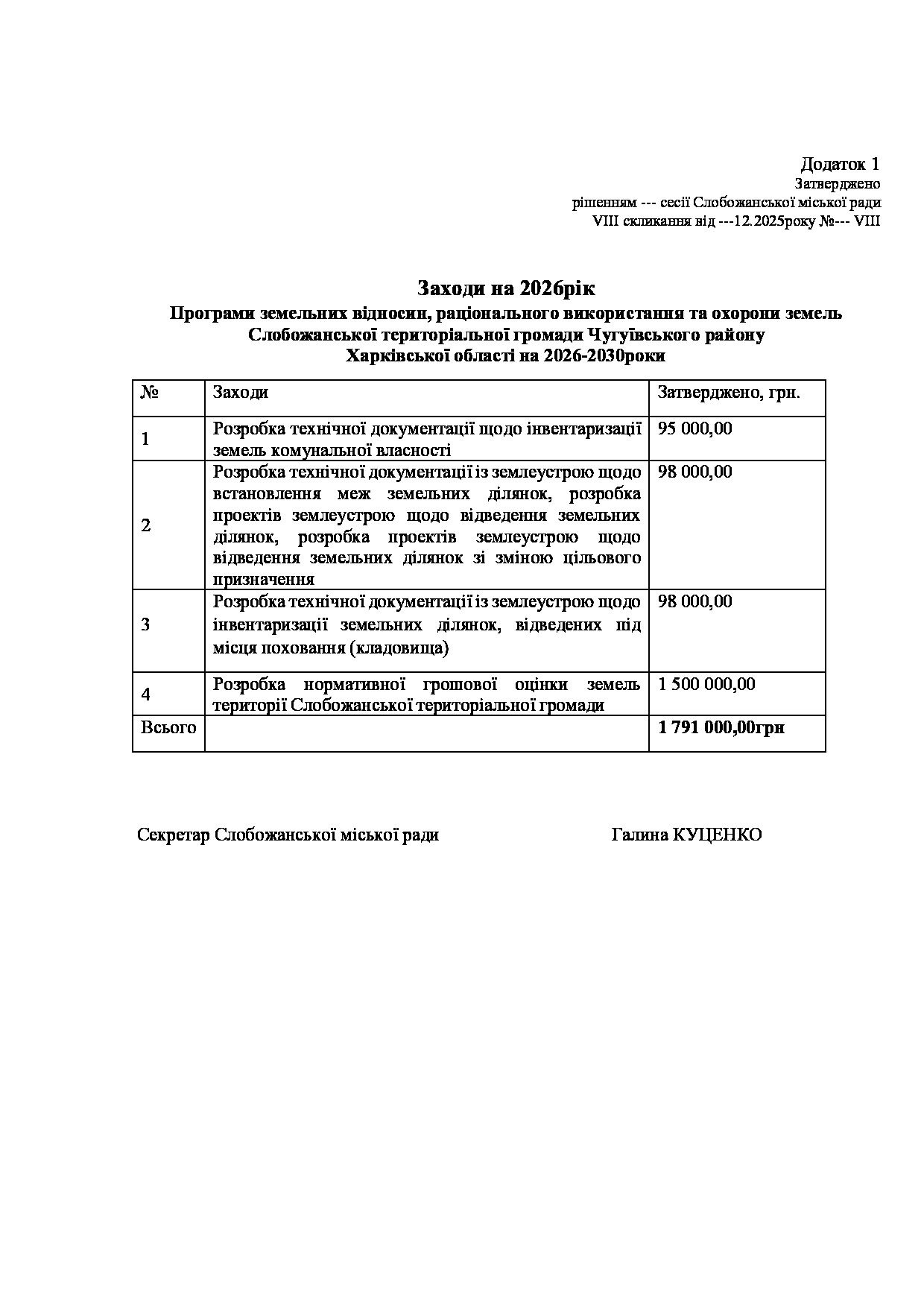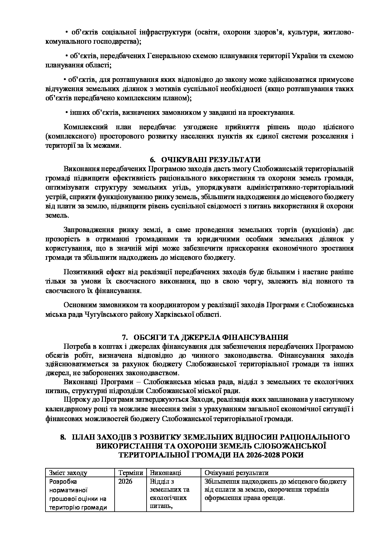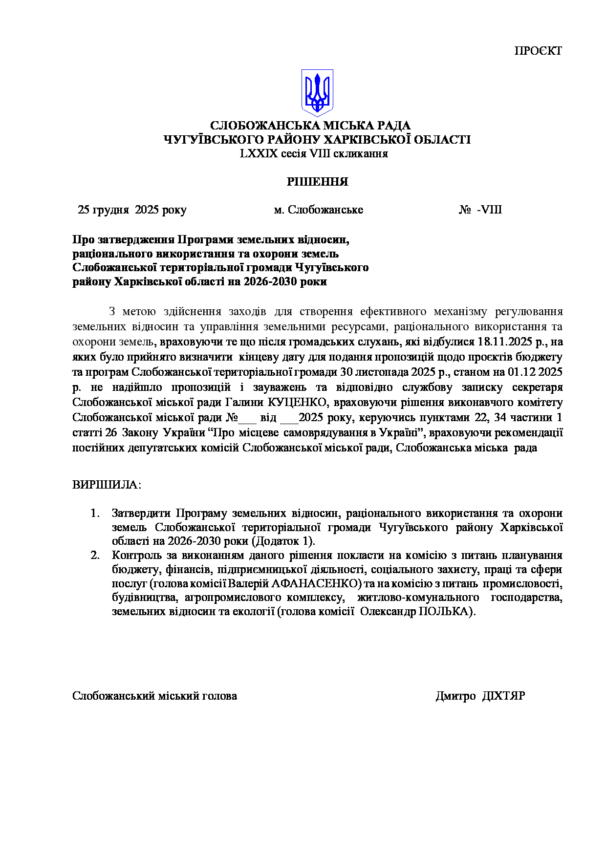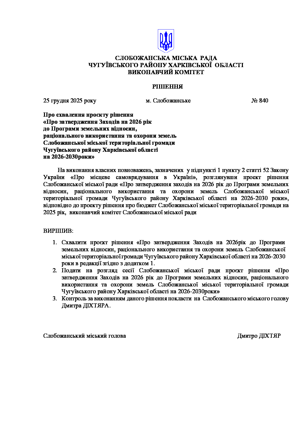 Рішення виконавчого комітету №840 Про схвалення проєкту рішення «Про затвердження Заходів на 2026 рік до Програми земельних відносин, раціонального використання та охорони земель Слобожанської міської територіальної громади Чугуївського району Харківської області на 2026-2030роки».