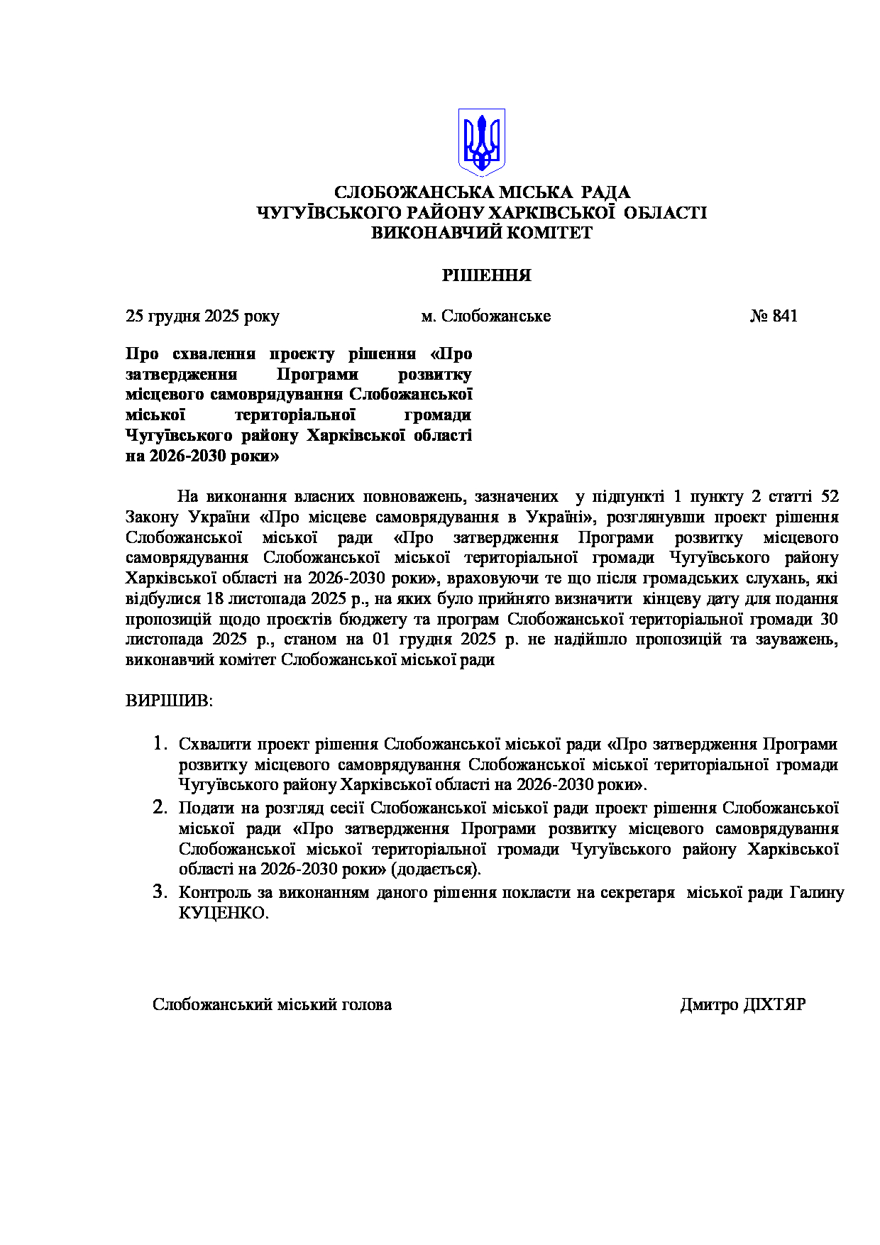 Рішення виконавчого комітету №841 Про схвалення проекту рішення «Про затвердження Програми розвитку місцевого самоврядування Слобожанської міської територіальної громади Чугуївського району Харківської області на 2026-2030 роки».
