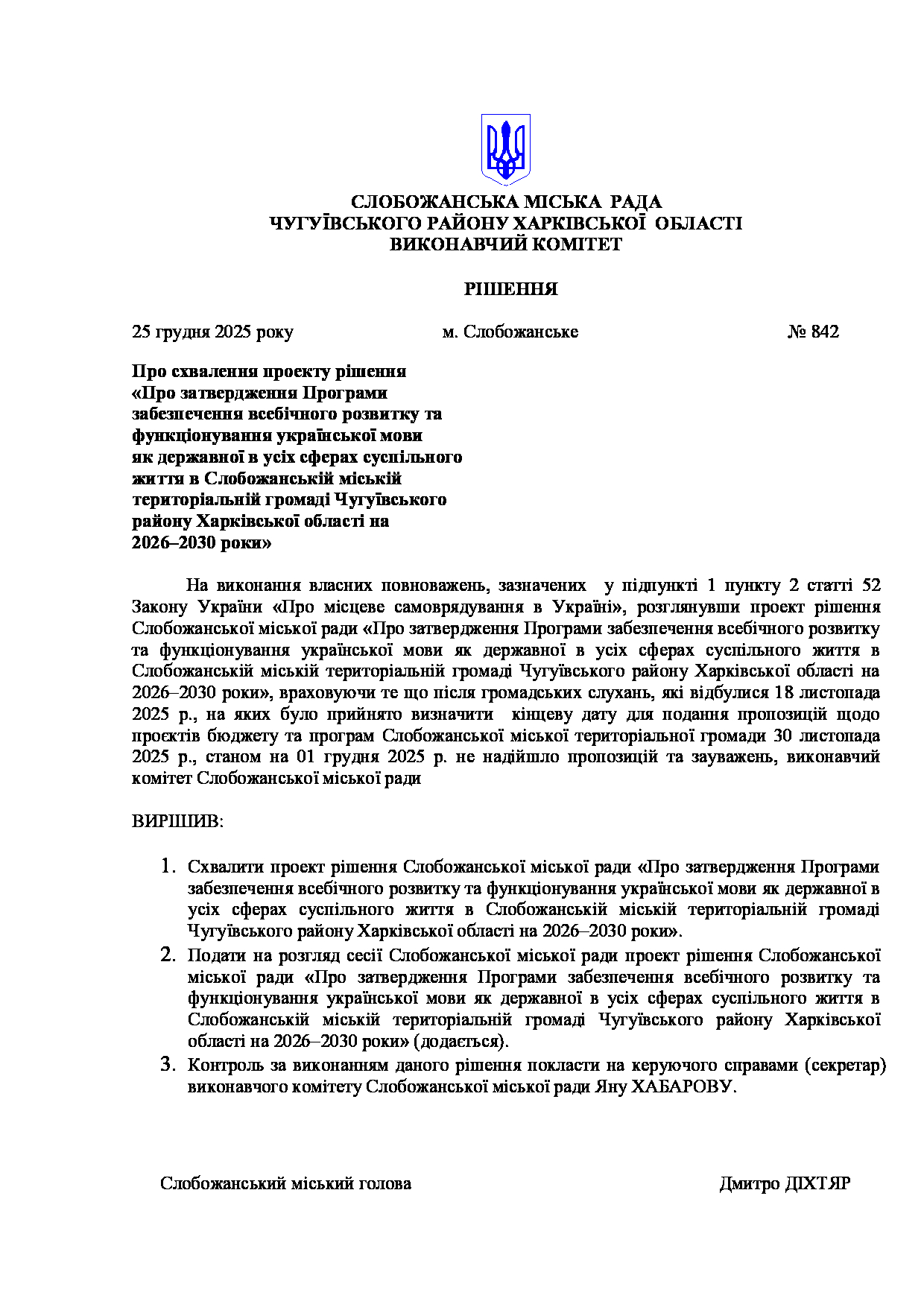 Рішення виконавчого комітету №842 Про схвалення проекту рішення «Про затвердження Програми забезпечення всебічного розвитку та функціонування української мови як державної в усіх сферах суспільного життя в Слобожанській міській територіальній громаді Чугуївського району Харківської області на 2026–2030 роки».