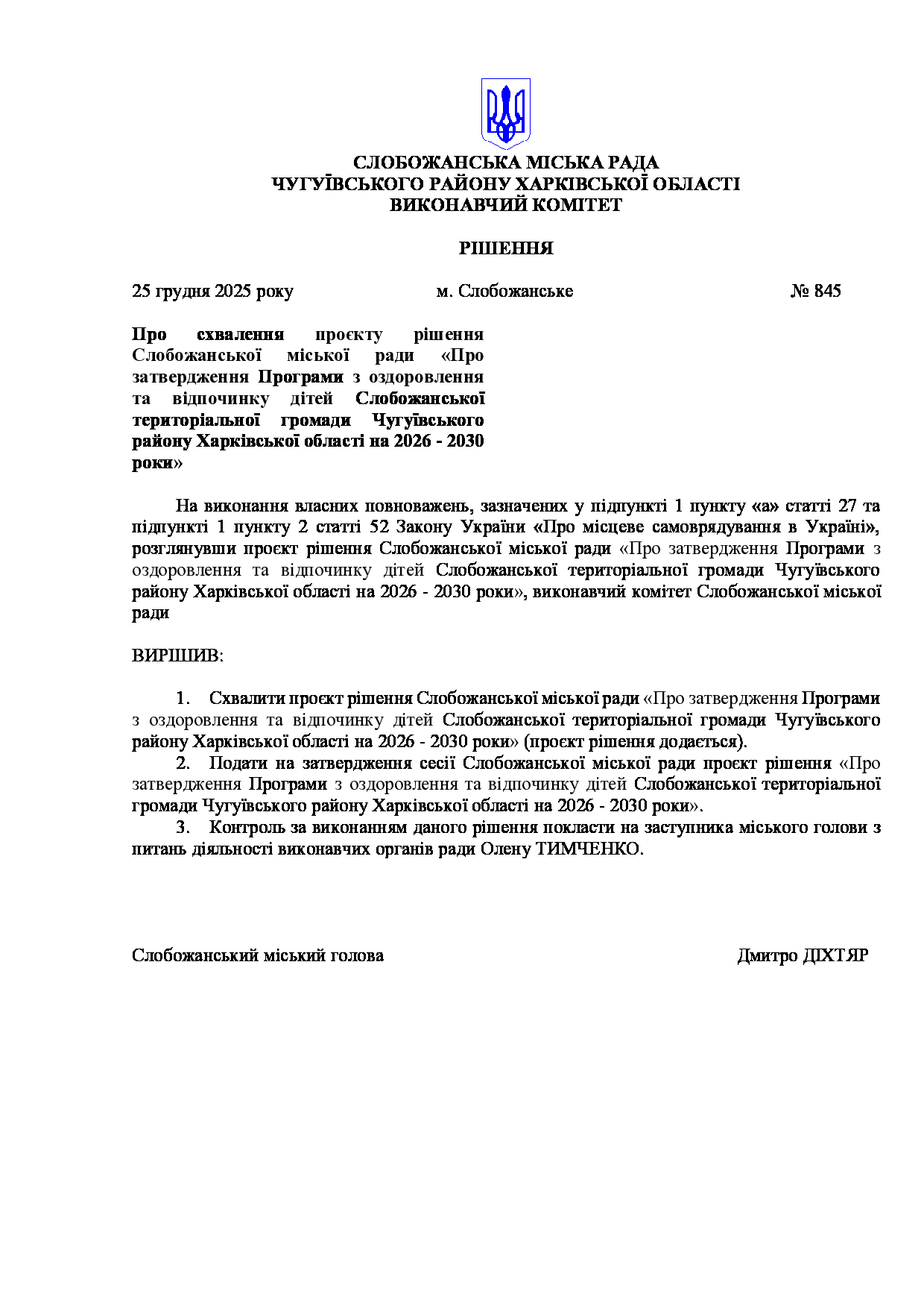 Рішення виконавчого комітету №845 Про схвалення проєкту рішення Слобожанської міської ради «Про затвердження Програми з оздоровлення та відпочинку дітей Слобожанської міської територіальної громади Чугуївського району Харківської області на 2026 - 2030 роки».