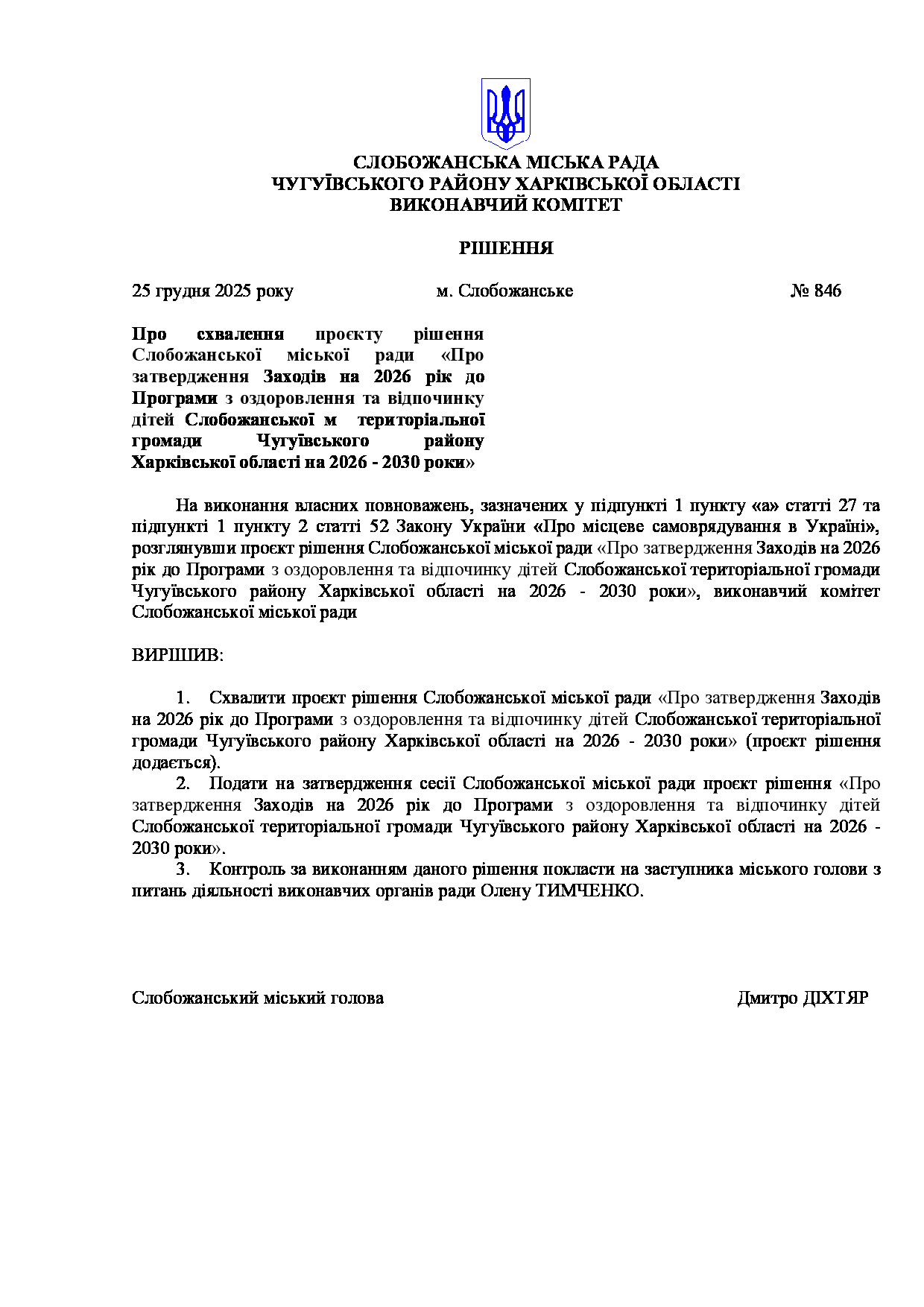 Рішення виконавчого комітету №846 Про схвалення проєкту рішення Слобожанської міської ради «Про затвердження Заходів на 2026 рік до Програми з оздоровлення та відпочинку дітей Слобожанської міської територіальної громади Чугуївського району Харківської області на 2026 - 2030 роки».