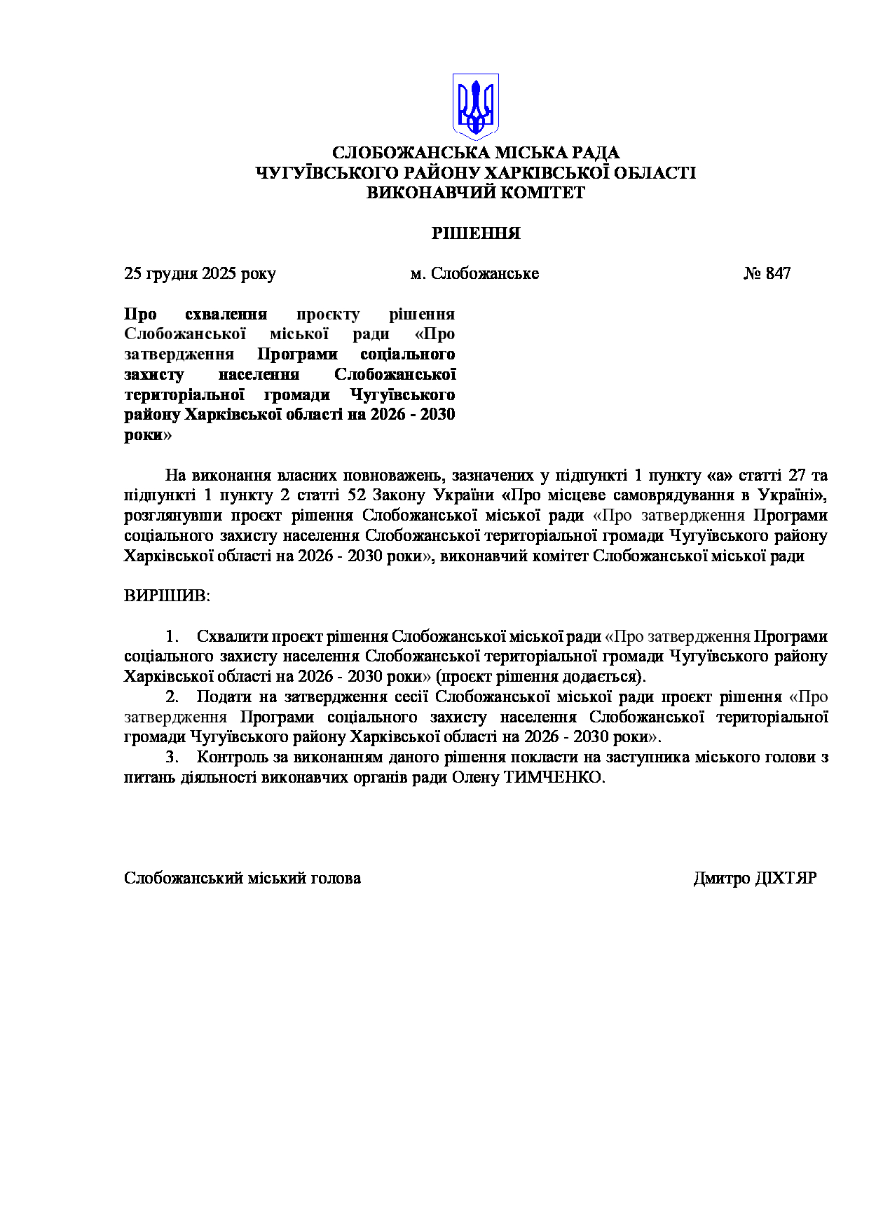 Рішення виконавчого комітету №847 Про схвалення проєкту рішення Слобожанської міської ради «Про затвердження Програми соціального захисту населення Слобожанської міської територіальної громади Чугуївського району Харківської області на 2026 - 2030 роки».