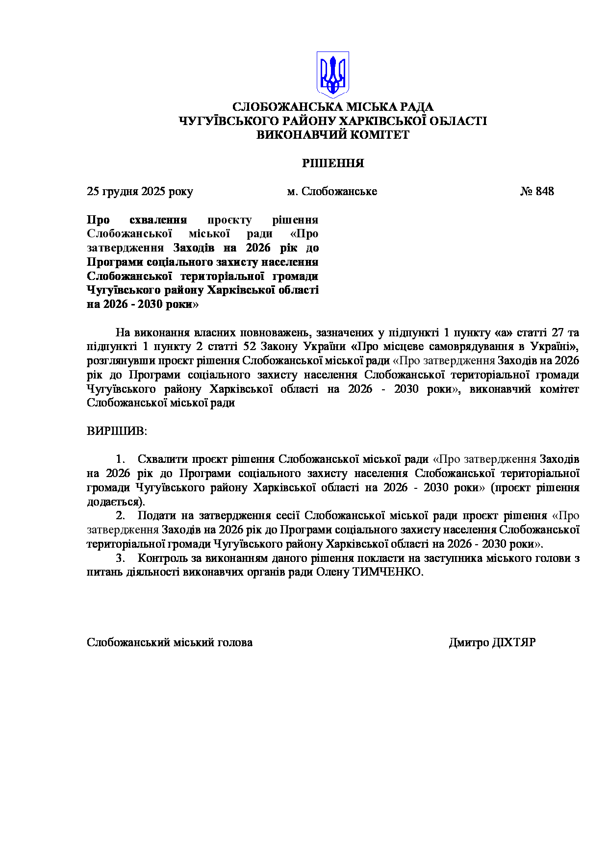 Рішення виконавчого комітету №848 Про схвалення проєкту рішення Слобожанської міської ради «Про затвердження Заходів на 2026 рік до Програми соціального захисту населення Слобожанської міської територіальної громади Чугуївського району Харківської області на 2026 - 2030 роки».