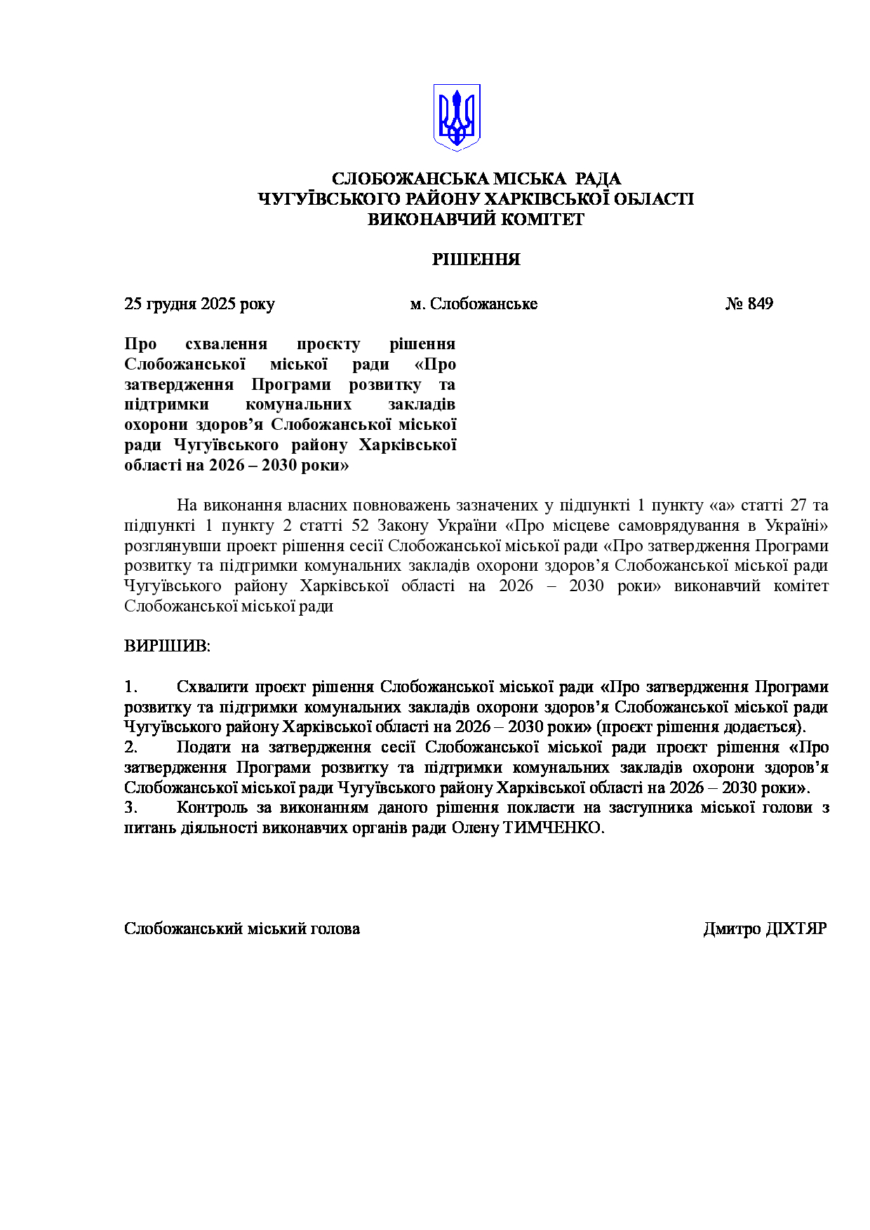 Рішення виконавчого комітету №849 Про схвалення проєкту рішення Слобожанської міської ради «Про затвердження Програми розвитку та підтримки комунальних закладів охорони здоров’я Слобожанської міської ради Чугуївського району Харківської області на 2026 – 2030 роки».