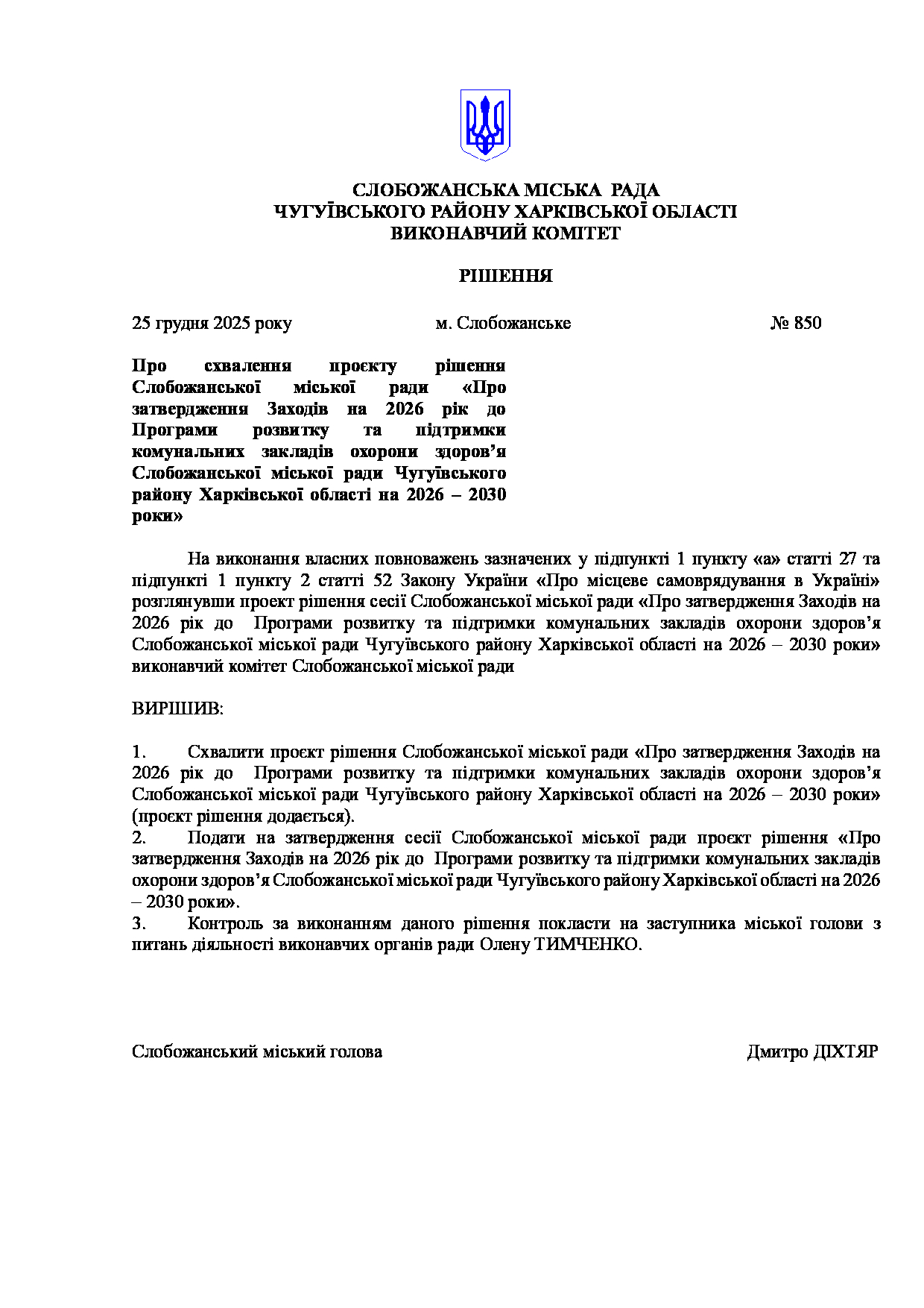 Рішення виконавчого комітету №850 Про схвалення проєкту рішення Слобожанської міської ради «Про затвердження Заходів на 2026 рік до Програми розвитку та підтримки комунальних закладів охорони здоров’я Слобожанської міської ради Чугуївського району Харківської області на 2026 – 2030 роки».
