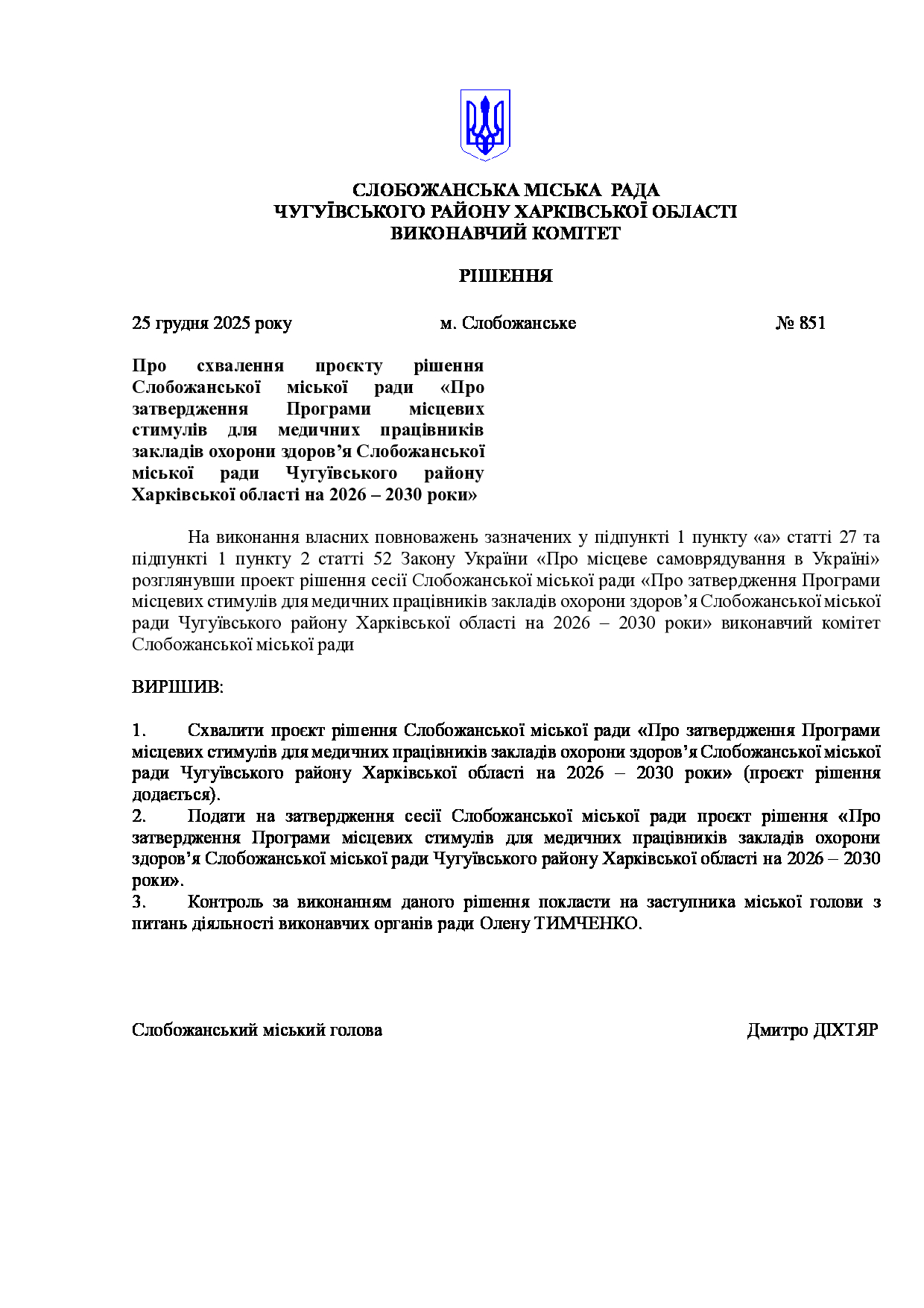 Рішення виконавчого комітету №851 Про схвалення проєкту рішення Слобожанської міської ради «Про затвердження Програми місцевих стимулів для медичних працівників закладів охорони здоров’я Слобожанської міської ради Чугуївського району Харківської області на 2026 – 2030 роки».