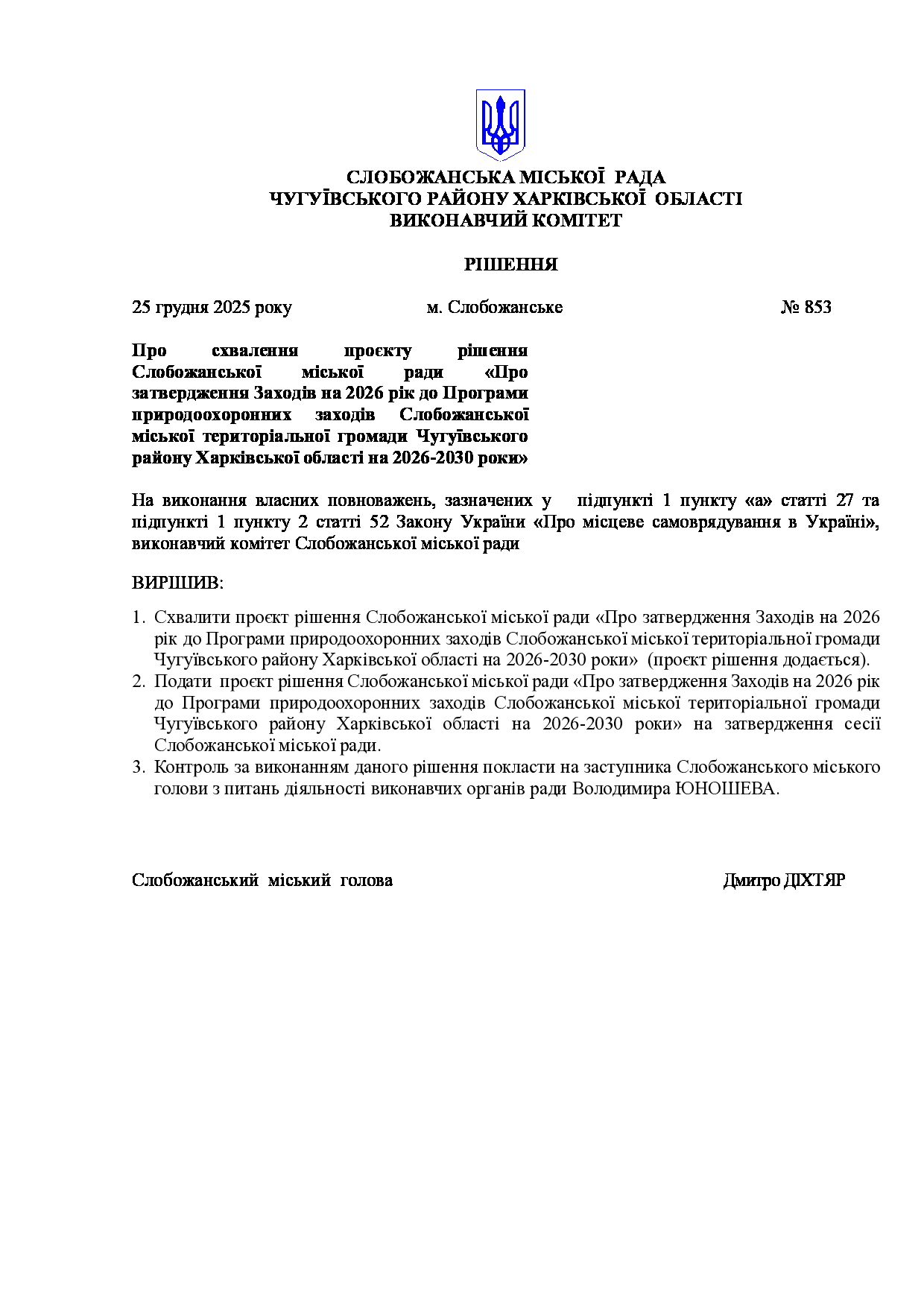 Рішення виконавчого комітету №853 Про схвалення проєкту рішення Слобожанської міської ради «Про затвердження Заходів на 2026 рік до Програми природоохоронних заходів Слобожанської міської територіальної громади Чугуївського району Харківської області на 2026-2030 роки».