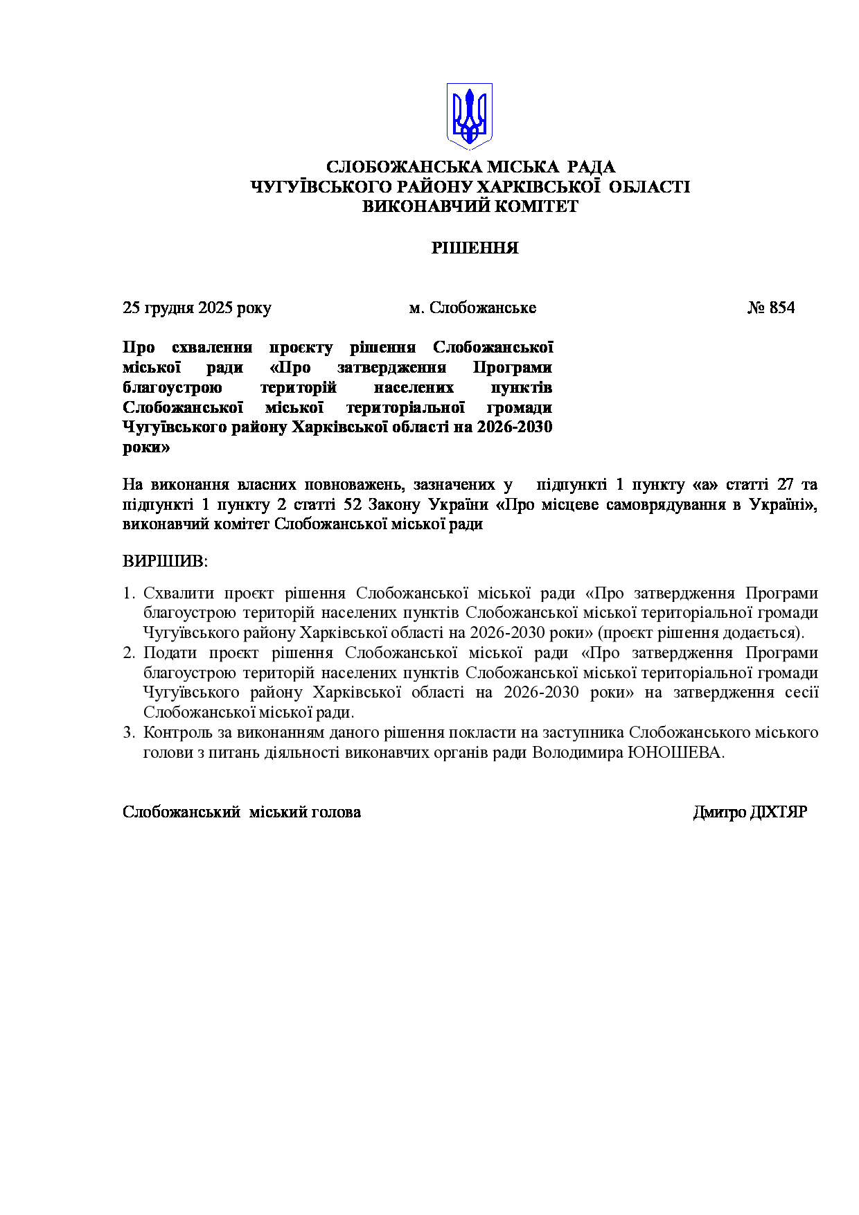 Рішення виконавчого комітету №854 Про схвалення проєкту рішення Слобожанської міської ради «Про затвердження Програми благоустрою територій населених пунктів Слобожанської міської територіальної громади Чугуївського району Харківської області на 2026-2030 роки».
