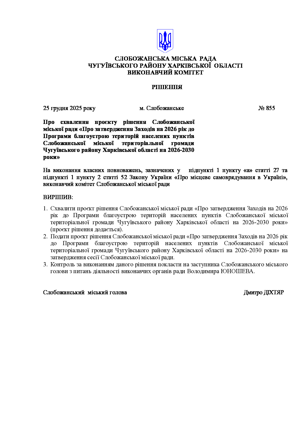 Рішення виконавчого комітету №855 Про схвалення проєкту рішення Слобожанської міської ради «Про затвердження Заходів на 2026 рік до Програми благоустрою територій населених пунктів Слобожанської міської територіальної громади Чугуївського району Харківської області на 2026-2030 роки».