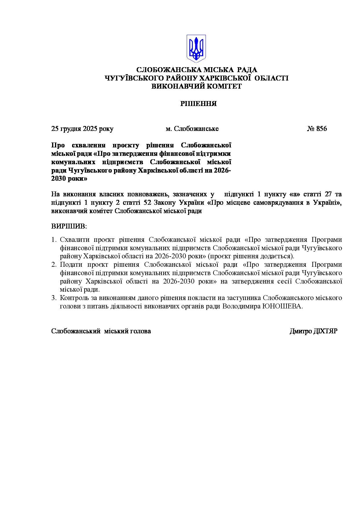 Рішення виконавчого комітету №856 Про схвалення проєкту рішення Слобожанської міської ради «Про затвердження фінансової підтримки комунальних підприємств Слобожанської міської ради Чугуївського району Харківської області на 2026-2030 роки».