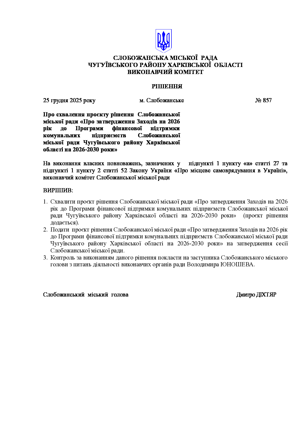 Рішення виконавчого комітету №857 Про схвалення проєкту рішення Слобожанської міської ради «Про затвердження Заходів на 2026 рік до Програми фінансової підтримки комунальних підприємств Слобожанської міської ради Чугуївського району Харківської області на 2026-2030 роки».