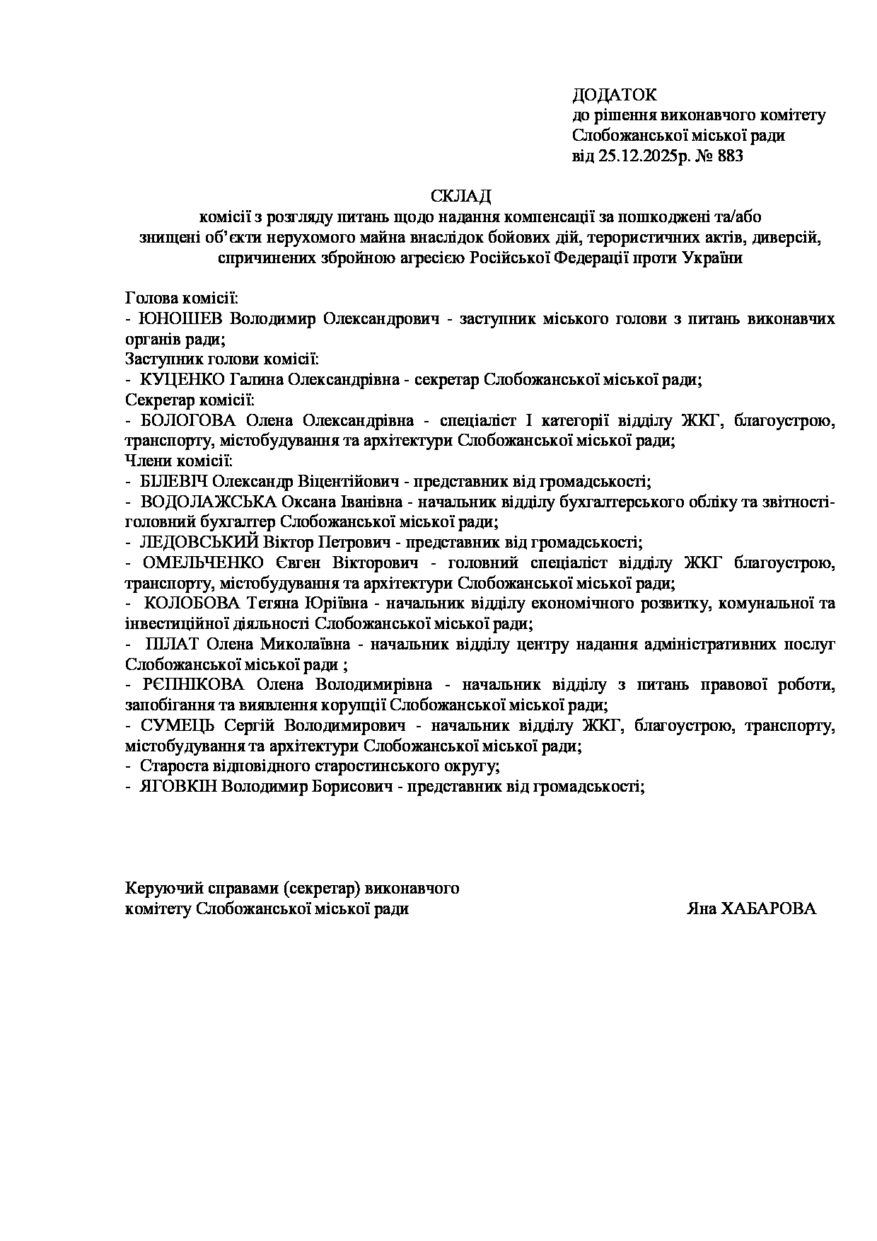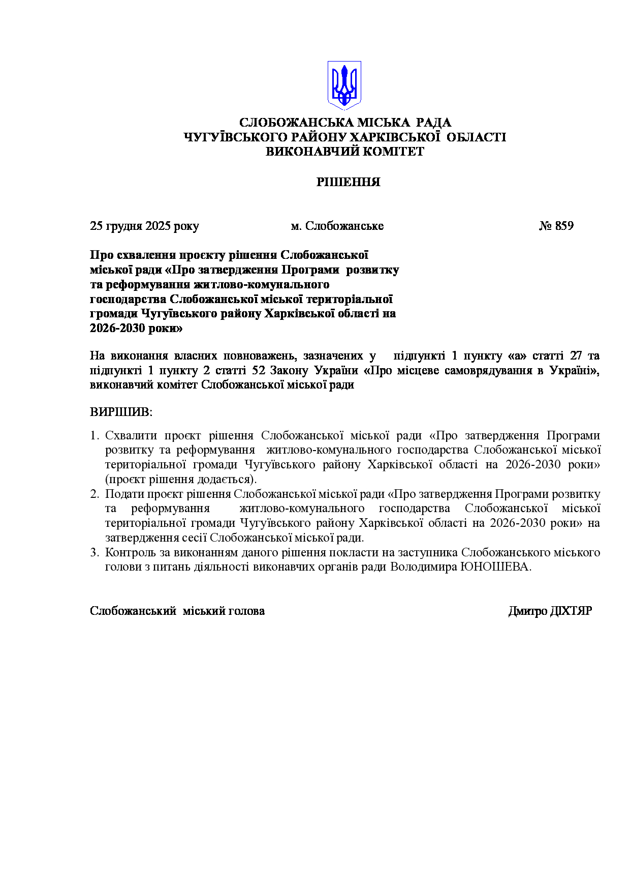 Рішення виконавчого комітету №859 Про схвалення проєкту рішення Слобожанської міської ради «Про затвердження Програми розвитку та реформування житлово-комунального господарства Слобожанської міської територіальної громади Чугуївського району Харківської області на 2026-2030 роки».