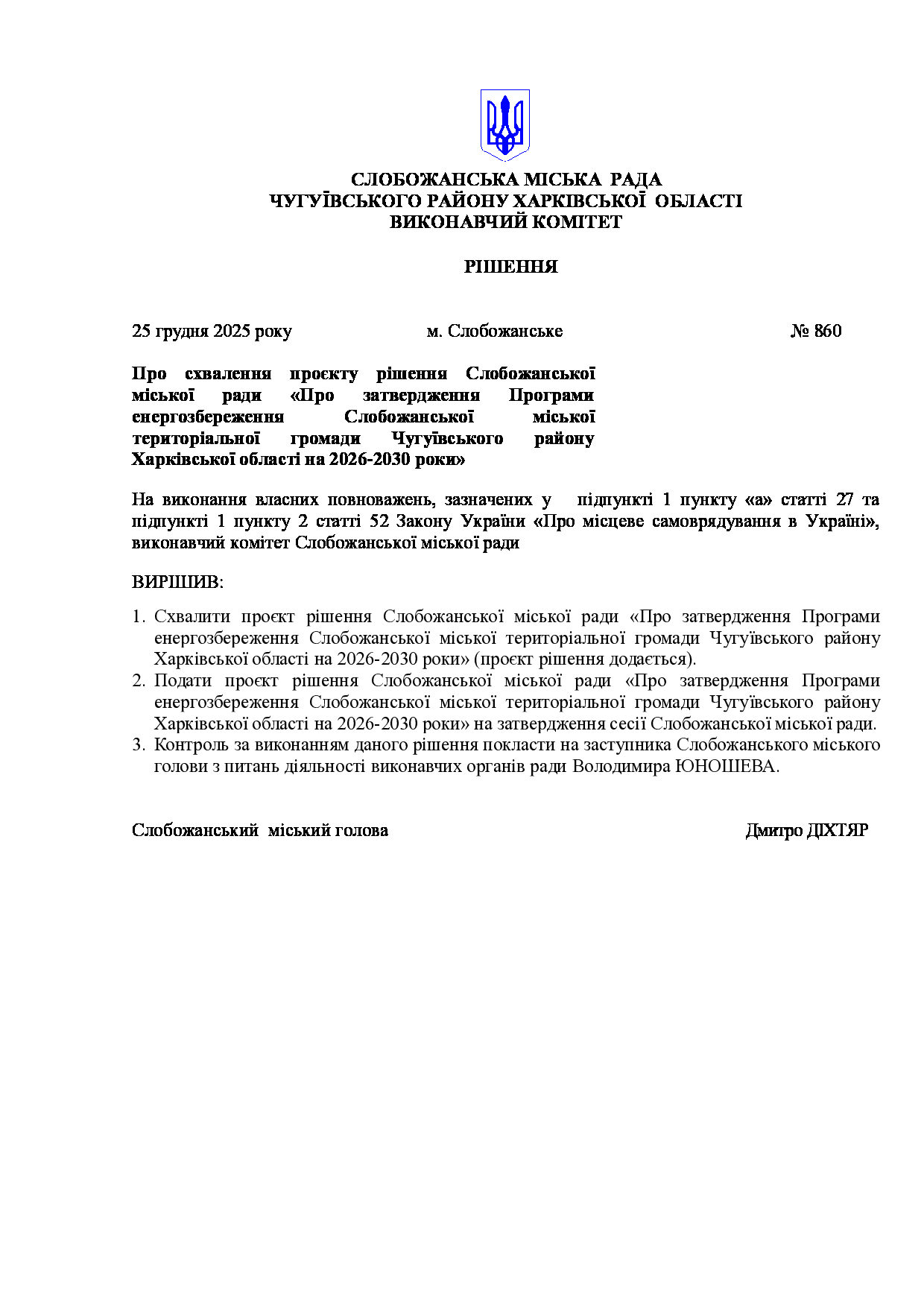 Рішення виконавчого комітету №860 Про схвалення проєкту рішення Слобожанської міської ради «Про затвердження Програми енергозбереження Слобожанської міської територіальної громади Чугуївського району Харківської області на 2026-2030 роки».