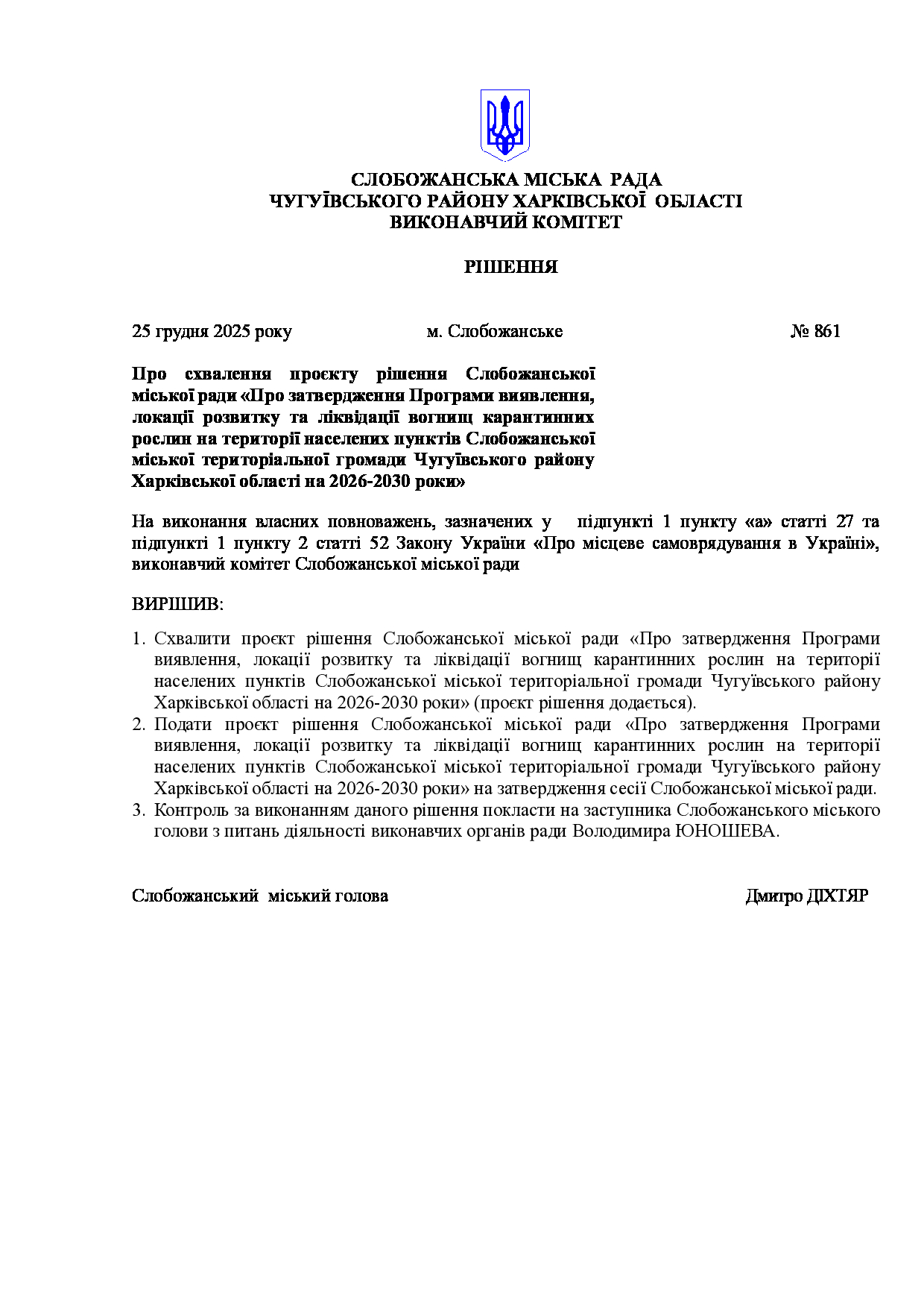 Рішення виконавчого комітету №861 Про схвалення проєкту рішення Слобожанської міської ради «Про затвердження Програми виявлення, локації розвитку та ліквідації вогнищ карантинних рослин на території населених пунктів Слобожанської міської територіальної громади Чугуївського району Харківської області на 2026-2030 роки».