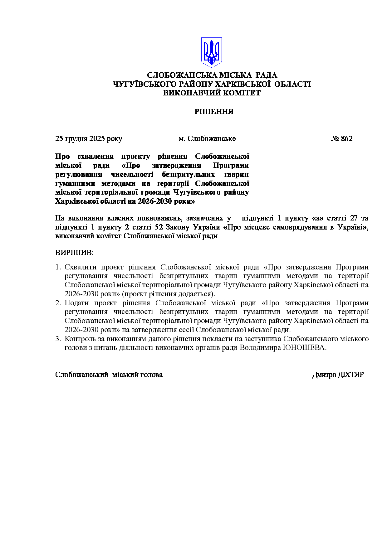 Рішення виконавчого комітету №862 Про схвалення проєкту рішення Слобожанської міської ради «Про затвердження Програми регулювання чисельності безпритульних тварин гуманними методами на території Слобожанської міської територіальної громади Чугуївського району Харківської області на 2026-2030 роки».