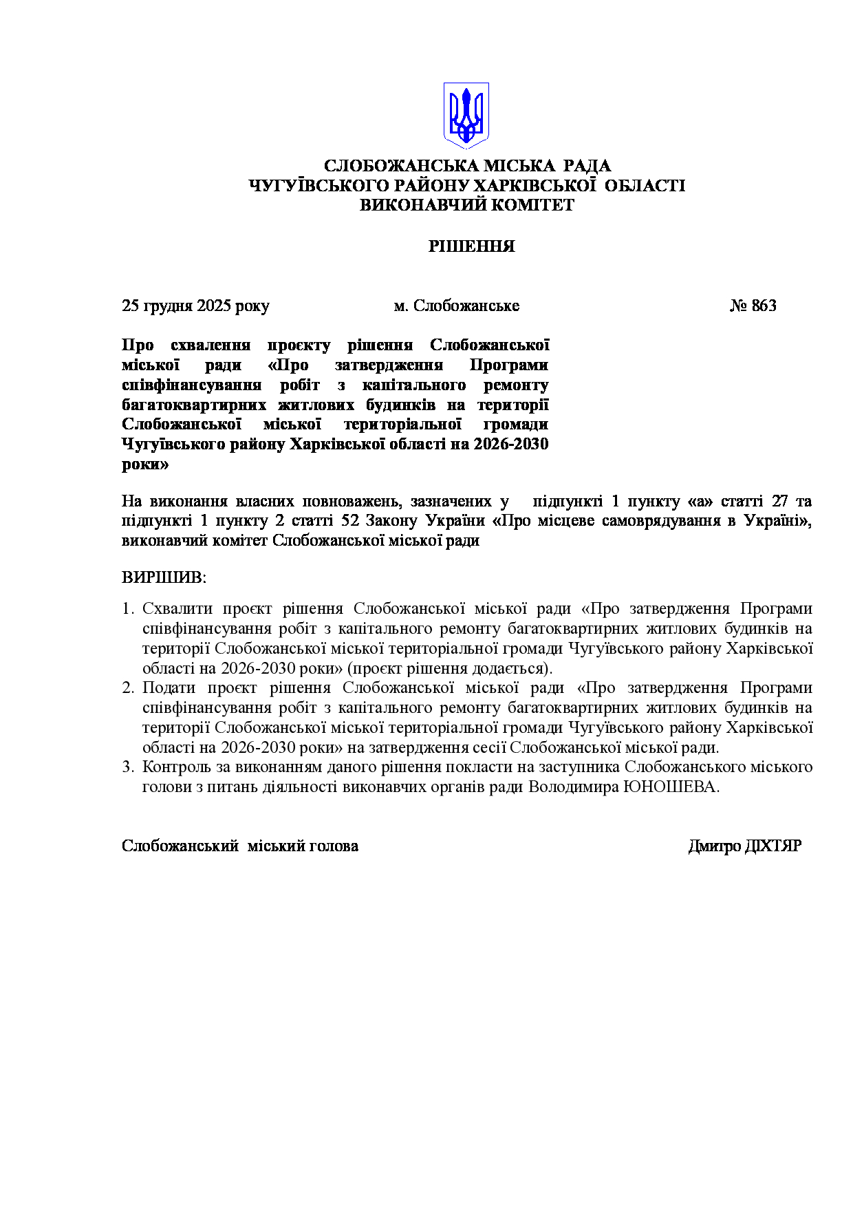 Рішення виконавчого комітету №863 Про схвалення проєкту рішення Слобожанської міської ради «Про затвердження Програми співфінансування робіт з капітального ремонту багатоквартирних житлових будинків на території Слобожанської міської територіальної громади Чугуївського району Харківської області на 2026-2030 роки».