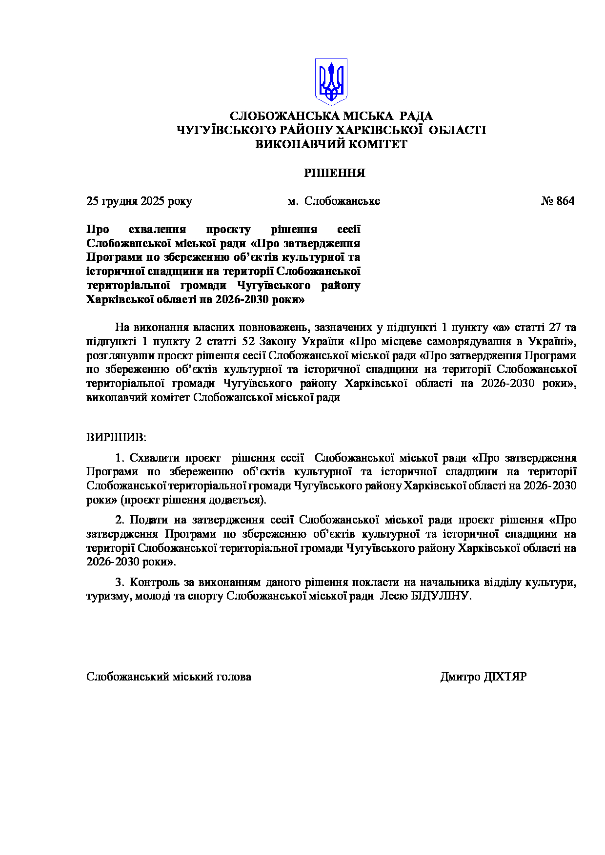 Рішення виконавчого комітету №864 Про схвалення проєкту рішення сесії Слобожанської міської ради «Про затвердження Програми по збереженню об’єктів культурної та історичної спадщини на території Слобожанської міської територіальної громади Чугуївського району Харківської області на 2026-2030 роки».