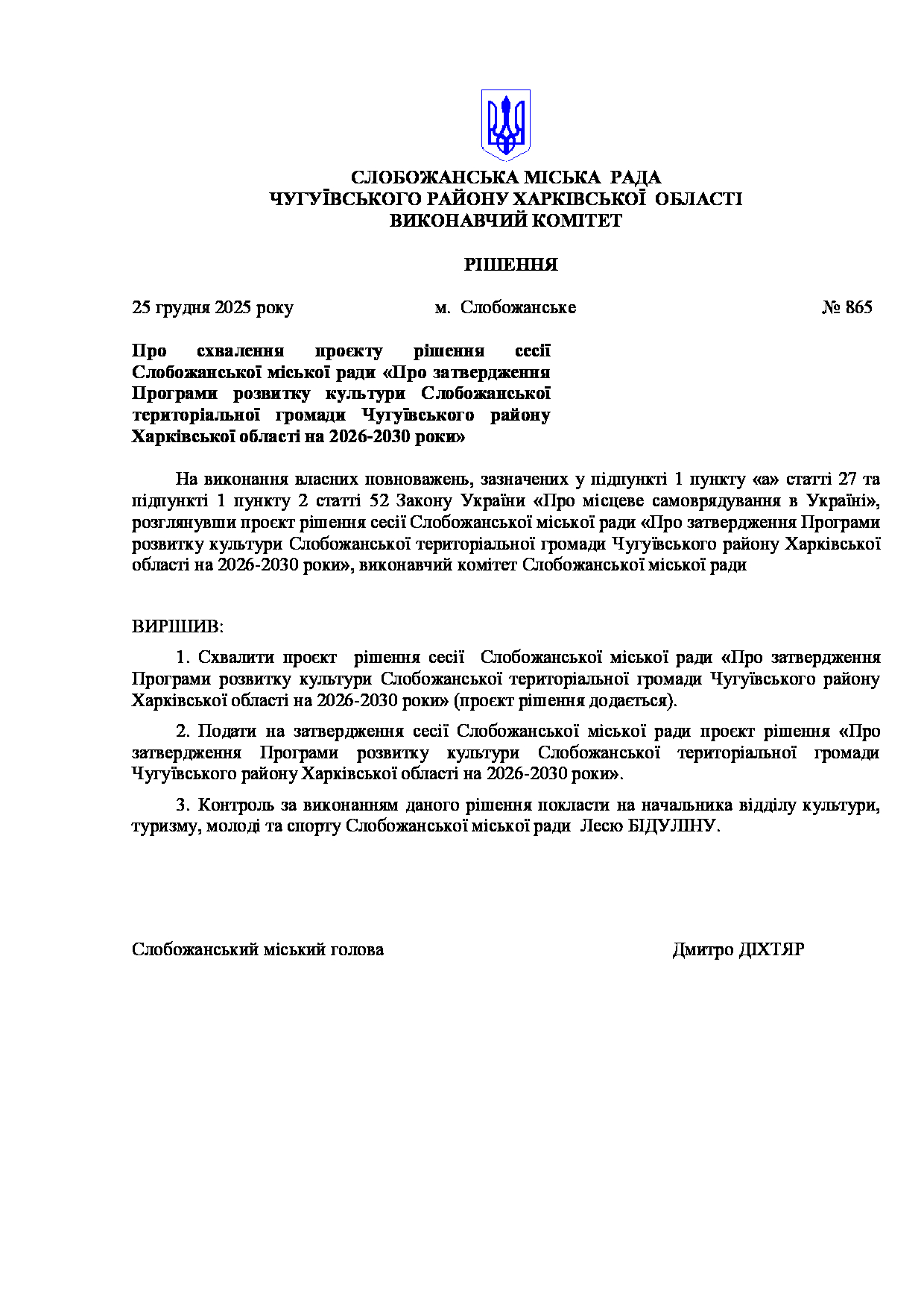 Рішення виконавчого комітету №865 Про схвалення проєкту рішення сесії Слобожанської міської ради «Про затвердження Програми розвитку культури Слобожанської міської територіальної громади Чугуївського району Харківської області на 2026-2030 роки».