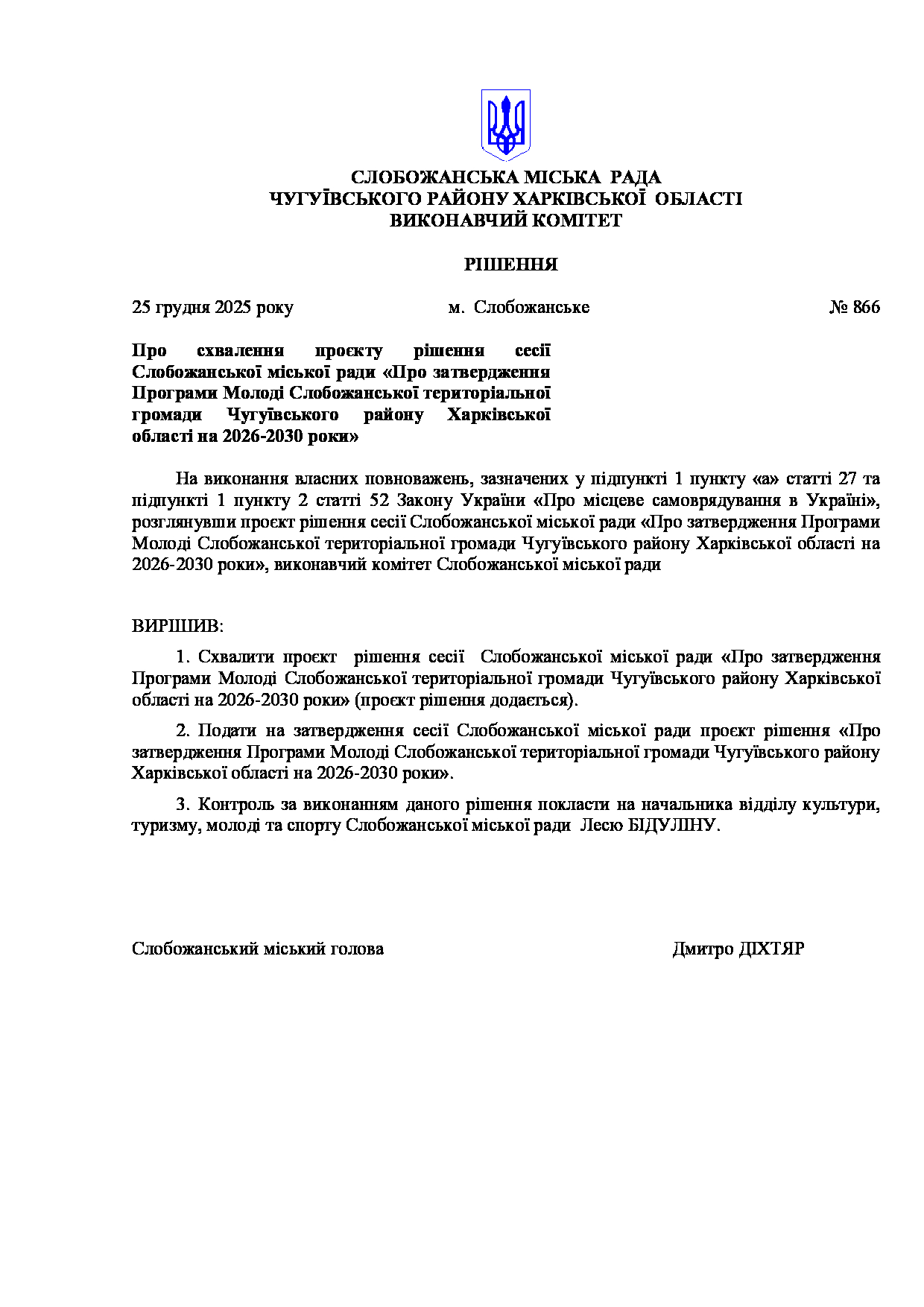 Рішення виконавчого комітету №866 Про схвалення проєкту рішення сесії Слобожанської міської ради «Про затвердження Програми Молоді Слобожанської міської територіальної громади Чугуївського району Харківської області на 2026-2030 роки».