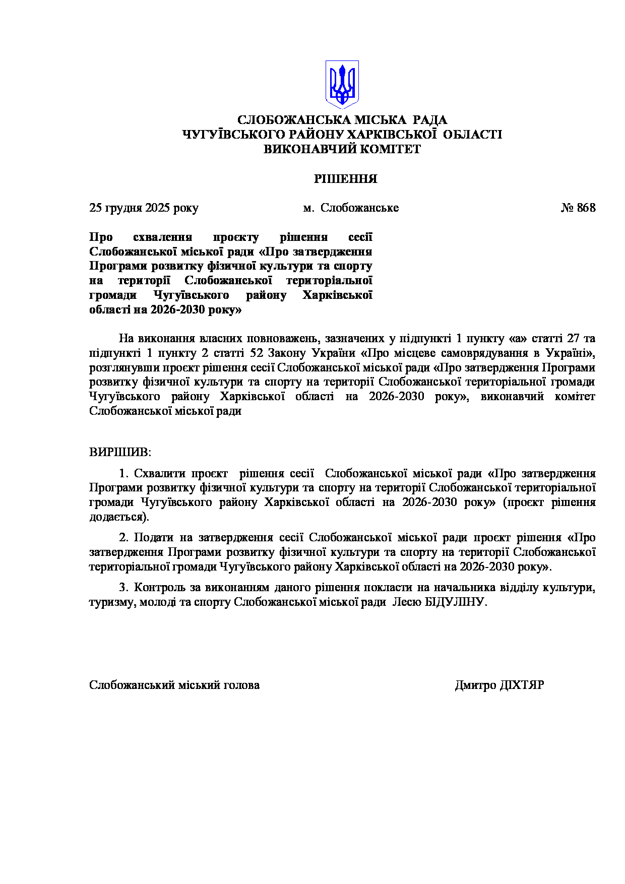 Рішення виконавчого комітету №868 Про схвалення проєкту рішення сесії Слобожанської міської ради «Про затвердження Програми розвитку фізичної культури та спорту на території Слобожанської міської територіальної громади Чугуївського району Харківської області на 2026-2030 року».