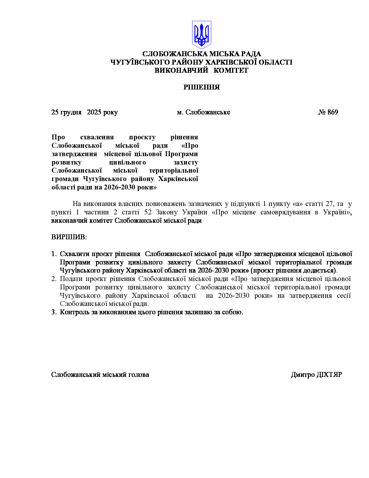 Рішення виконавчого комітету №869 Про схвалення проєкту рішення Слобожанської міської ради «Про затвердження місцевої цільової Програми розвитку цивільного захисту Слобожанської міської територіальної громади Чугуївського району Харківської області ради на 2026-2030 роки».