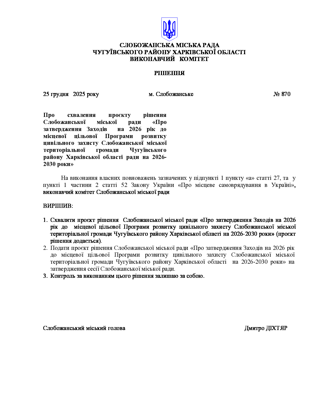 Рішення виконавчого комітету №870 Про схвалення проєкту рішення Слобожанської міської ради «Про затвердження Заходів на 2026 рік до місцевої цільової Програми розвитку цивільного захисту Слобожанської міської територіальної громади Чугуївського району Харківської області ради на 2026-2030 роки».