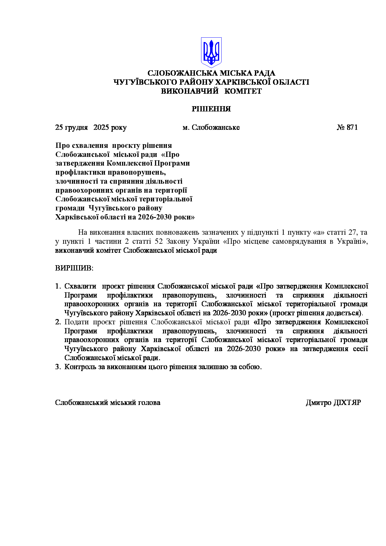 Рішення виконавчого комітету №871 Про схвалення проєкту рішення Слобожанської міської ради «Про затвердження Комплексної Програми профілактики правопорушень, злочинності та сприяння діяльності правоохоронних органів на території Слобожанської міської територіальної громади Чугуївського району Харківської області на 2026-2030 роки».