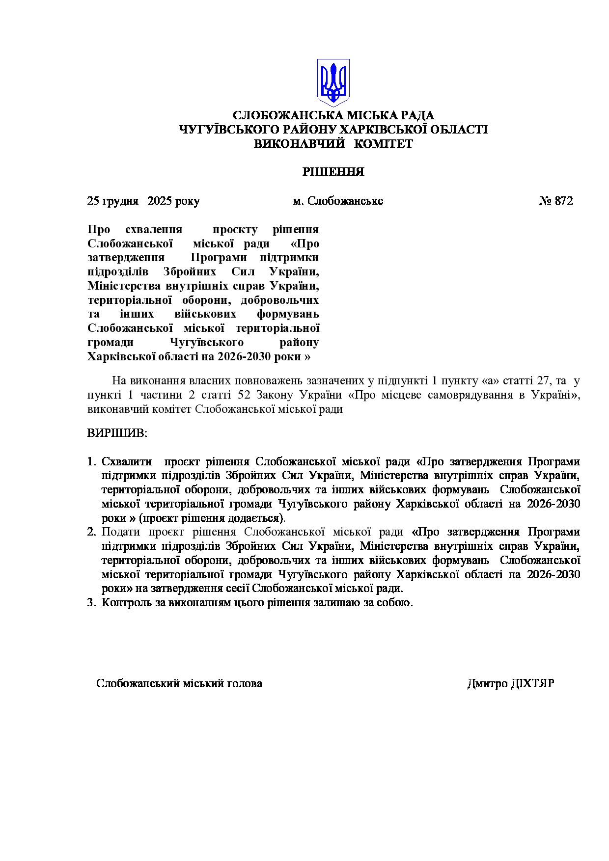 Рішення виконавчого комітету №872 Про схвалення проєкту рішення Слобожанської міської ради «Про затвердження Програми підтримки підрозділів Збройних Сил України, Міністерства внутрішніх справ України, територіальної оборони, добровольчих та інших військових формувань Слобожанської міської територіальної громади Чугуївського району Харківської області на 2026-2030 роки».