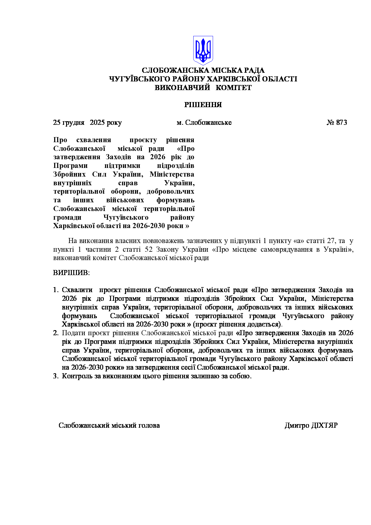 Рішення виконавчого комітету №873 Про схвалення проєкту рішення Слобожанської міської ради «Про затвердження Заходів на 2026 рік до Програми підтримки підрозділів Збройних Сил України, Міністерства внутрішніх справ України, територіальної оборони, добровольчих та інших військових формувань Слобожанської міської територіальної громади Чугуївського району Харківської області на 2026-2030 роки ».