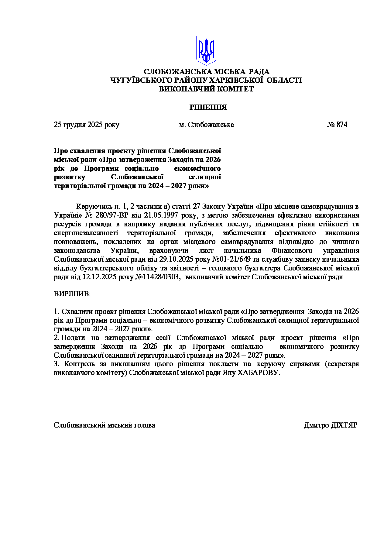 Рішення виконавчого комітету №874 Про схвалення проекту рішення Слобожанської міської ради «Про внесення змін в Заходи на 2025 рік до Програми соціально – економічного розвитку Слобожанської селищної територіальної громади на 2024 – 2027 роки».
